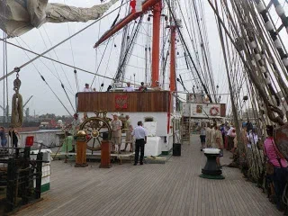 И таки да — это здоровенный корабль. Даже когда видишь его в порту — он уже внушает уважение. А когда идёшь внутри, от одного отсека к другому, или по палубам от кормы до бака — то по сути проходишь длину футбольного поля. И это поле находится в океане, управляемое вручную, движется при помощи силы ветра и совсем немножко при помощи двигателя. И управляется вручную — это не метафора, ибо реально нужно крутить здоровенный штурвал, который тросами дальше поворачивает перо руля — никакой электроники или гидравлики в помощь, руками чувствуешь биение океана и сопротивление волн.