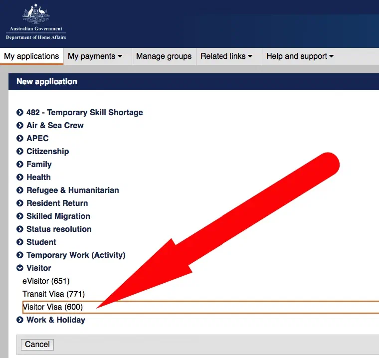В левом верхнем углу - New application, нажимаем туда, в списке выбираем Visitor visa и в подразделе - Visitor Visa (600) - остальные варианты для паспорта РФ не катят.