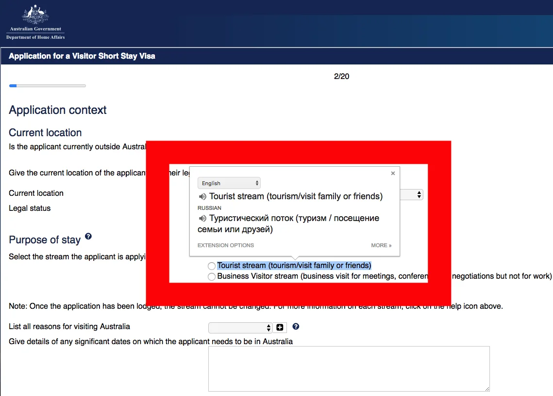 Не врать, конечно, важно. Но очковать из-за мелких ошибок или неточностей тоже нет повода, до момента когда заявление будет формально отправлено на рассмотрение ещё долго и будет возможность всё проверить и исправить. Набор вопросов - немножко посложней чем в США, чуть больше деталей и меньше дурных запросов про прошлое. Кто плохо понимает на английском - самое время пользоваться браузером Chrome и в нём включить плагин Google Translate - он позволяет быстро перевести выделенный мышкой фрагмент, если вдруг сомневаетесь в термине, удобно и не нарушает работу системы.