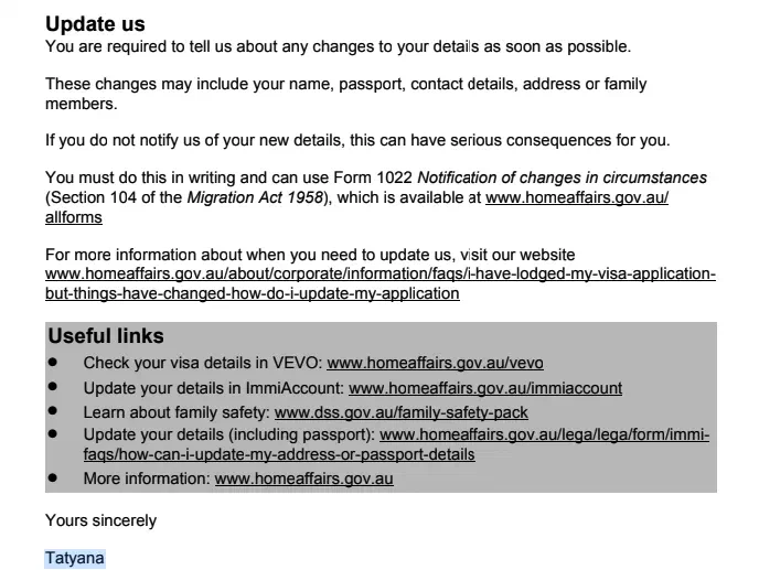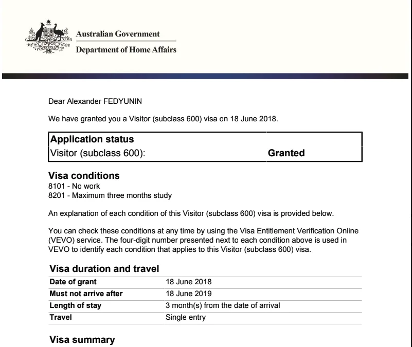 Всё, этих документов было достаточно - проверил ещё раз все данные, выбрал “подать заявление”, дают переход на оплату. Прямо у них с сайта оплата картой, 140 австралийских долларов + процент (зависит от типа карты, примерно 1.5-2). После оплаты заявление нужно окончательно подтвердить, они говорят что принято в работу, ждите ХХ дней (в нашем случае писали что примерно 20, с учётом количества заявлений в очереди), по факту на 2 дня раньше пришло сообщение на почту с вложением о том, что виза одобрена, мол велком ту Австралия. И просьбой сообщить им (через тот же портал), если что-то изменится в документах, или сами документы вдруг станут другие.