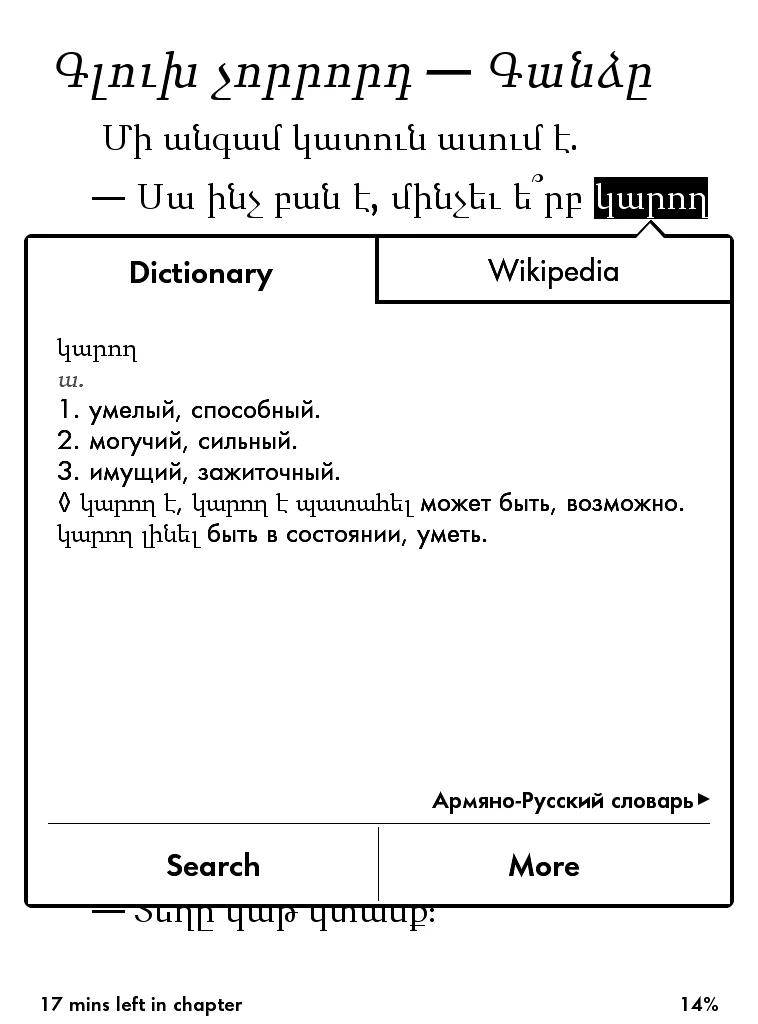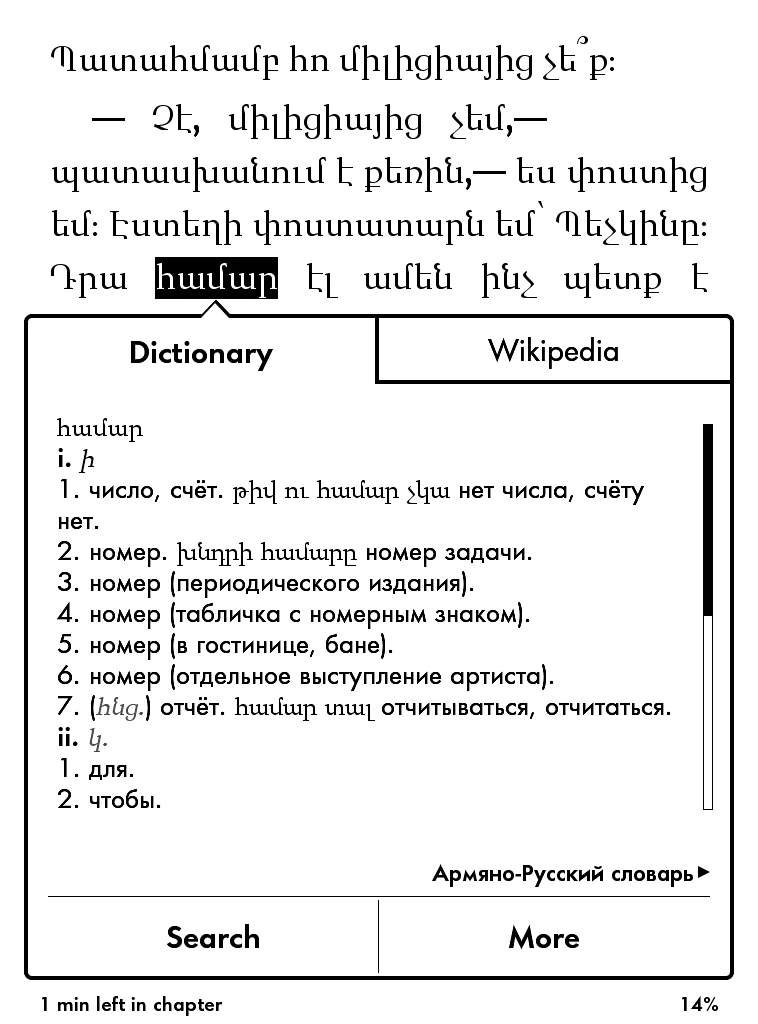 Оказалось что в сети нет готового словаря для чтения книг на армянском с Киндла (чтобы можно было выделить слово в тексте и посмотреть перевод). Пришлось изучать разные инструкции по этой теме, в итоге сделал словарик, можно пользоваться :)