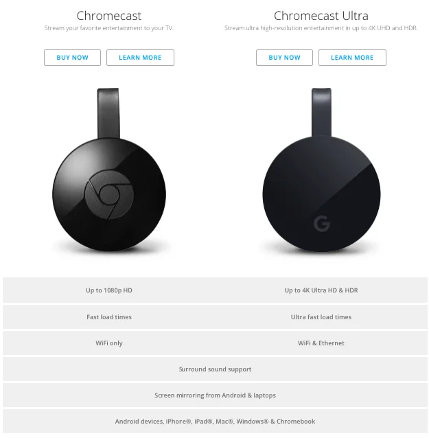 Stream up to 4K Ultra HD & HDR picture quality over your WiFi network with Chromecast Ultra, a streaming device that plugs into your TV’s HDMI port. Chromecast Ultra provides fast, reliable performance with minimal buffering and smoother streaming.