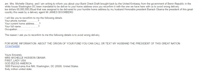 Нигерийские спамеры отжигают, пишут письмо от имени Мишель Обамы, не стеснясьMRS MICHELLE HUSSEIN OBAMA