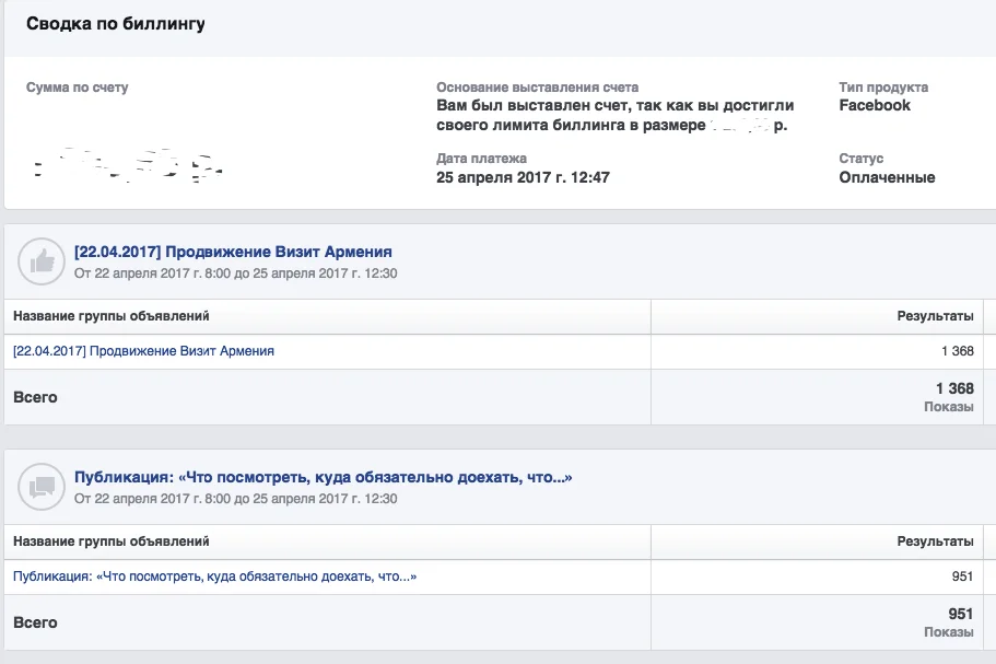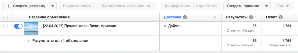 Решил тут проверить как работает реклама Фейсбука для страниц, которую они начинают советовать по десять раз на дню, стоит только создать хоть одну страницу. Как раз удобно - для “Визит Армения” решил посмотреть, что это даст при таргетинге на жителей России, которым интересны путешествия, горы и еда.