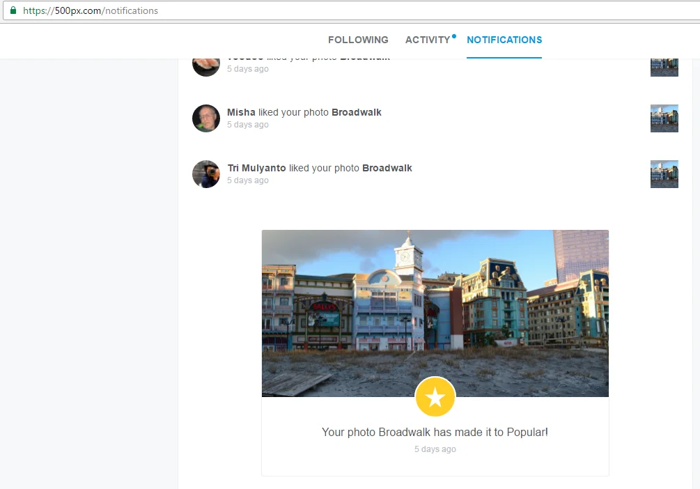 К чему я собственно это вспомнил то? Тут у них конкурсы оказывается проводят с призами, я на прошлых выходных вписался (ну типа раз уж у меня лимит на загрузки, загружу как я что-то из старенького в конкурс). А сегодня глянул - а там того, уже даже фотки мои в популярных, успех считай :) Хотя у них там 25 лайков - уже популярный, но с учётом что у меня подписчиков то не было вообще, это получается в 25 тысяч миллионв раз больше на одного френда чем в Инстаграмме*, там на тысячу френдов больше сотни лайков редко когда собирается. И то же самое фото из Атлантик-Сити там собрало 72 лайка за полтора месяца. Так что для “поскрёбывания тщеславия” проект вполне годный :)