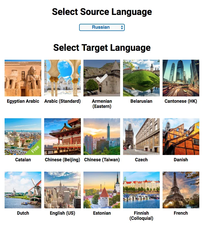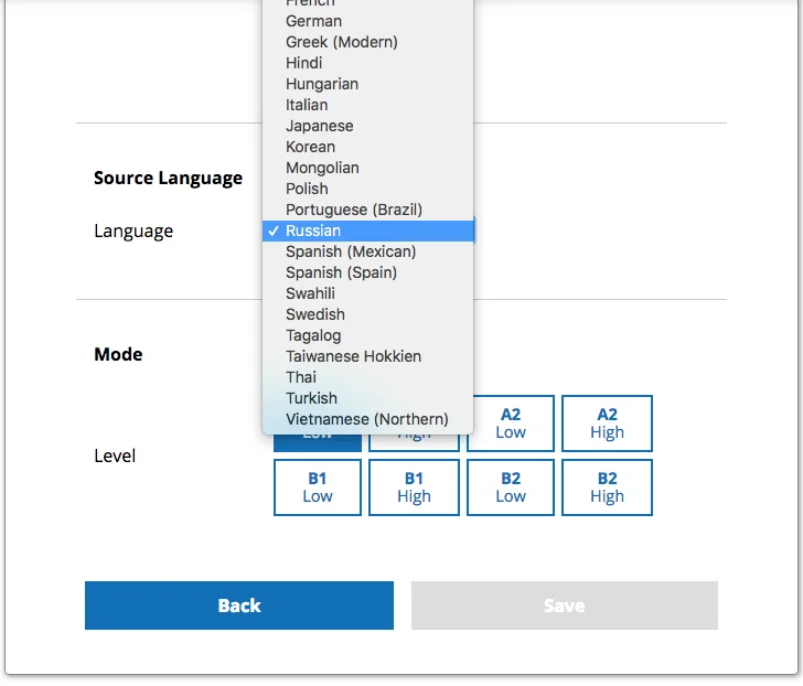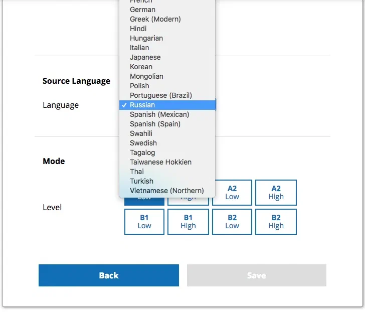 Сначала надо выбрать языковую пару - с какого языка будет производиться обучение и какому. И тут, конечно, огромный плюс - среди трёх языков, есть и русский. Кстати, недавно появился, третьим по доступности (при том что интерфейс сайта до сих пор только на английском или китайском). Затем выбираем язык который хочется выучить - для русского куча, для английского ещё больше.