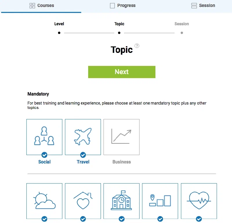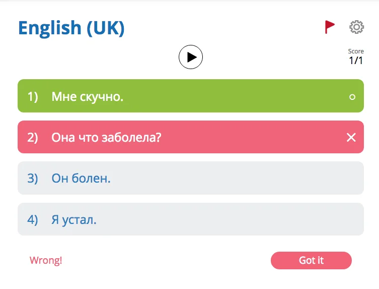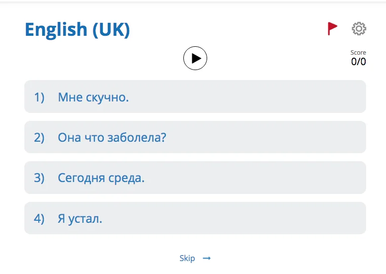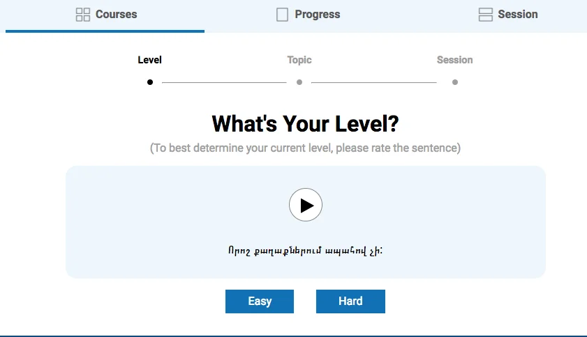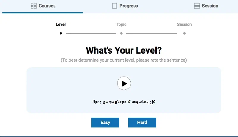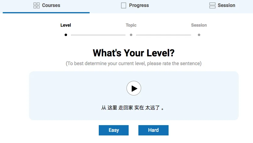 После этого нужно будет пройти тест на знание языка - прослушать одну или несколько фраз, чтобы система поняла примерный уровень владения языком. Ну, например, китайский - и тогда после ответа Hard на первой же фразе, мне подобрали простых фраз для изучения. Но не стоит переживать - всегда можно изменить свой уровень сложности как напрямую, так и через обратную связь по урокам.