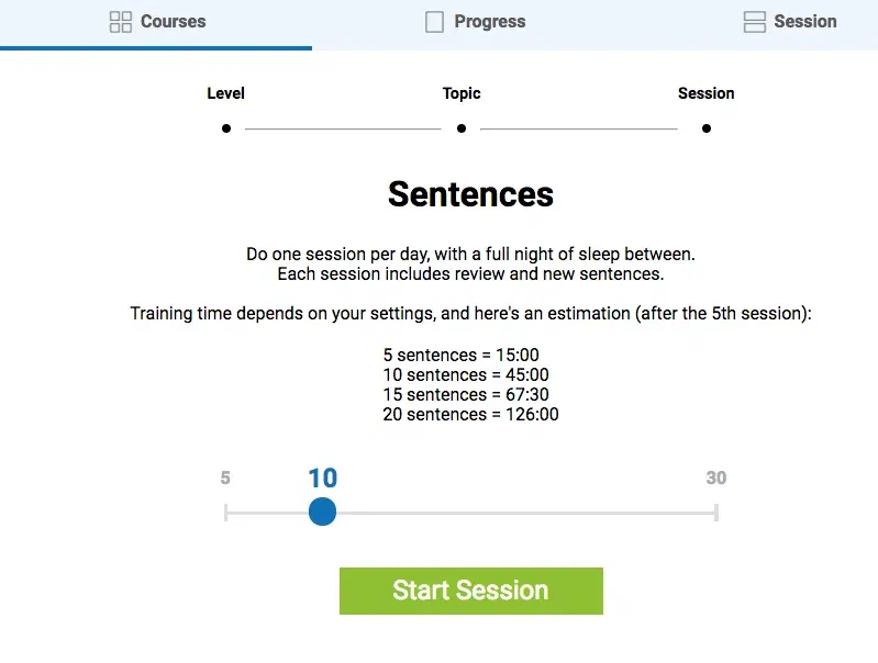 А также настроить объём занятий за урок (количество повторов и примерное которое для этого потребуется). Заниматься же лучше ежедневно, потому нужно ставить реальный объём, если в выходные захочется сделать больше - нет проблем, можно запустить больше повторов в конкретный день.