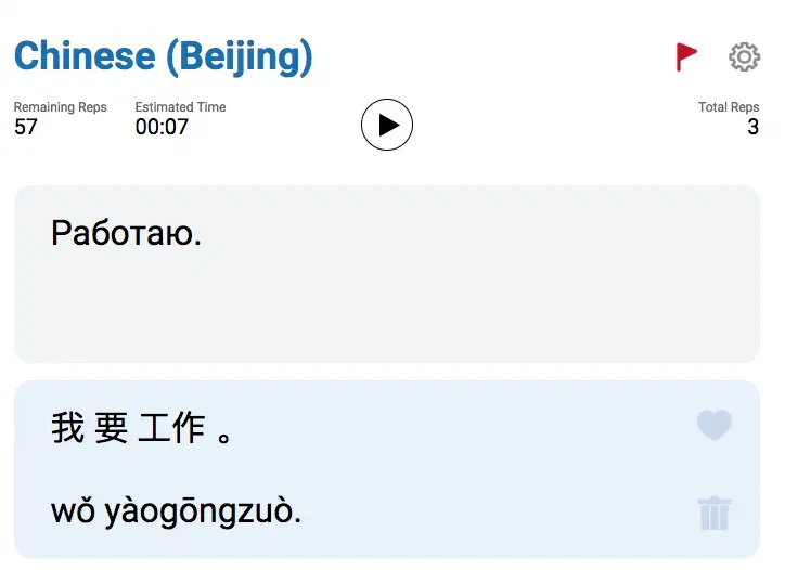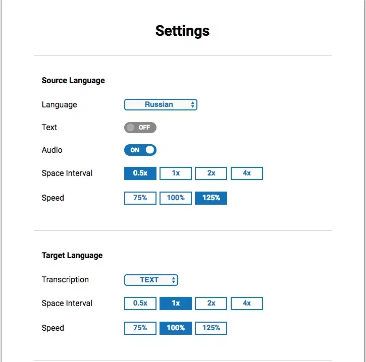 Далее же всё просто - классические карточки в реалиях 21-го века. Исходный текст с озвучкой, потом диктор говорит на изучаемом языке, нужно повторить. Под свои ощущения можно настроить скорость, паузы, показывать или не показывать тексты, в каком формате показывать тексты (на изучаемом алфавите, или же на одном из языков транскрипции).