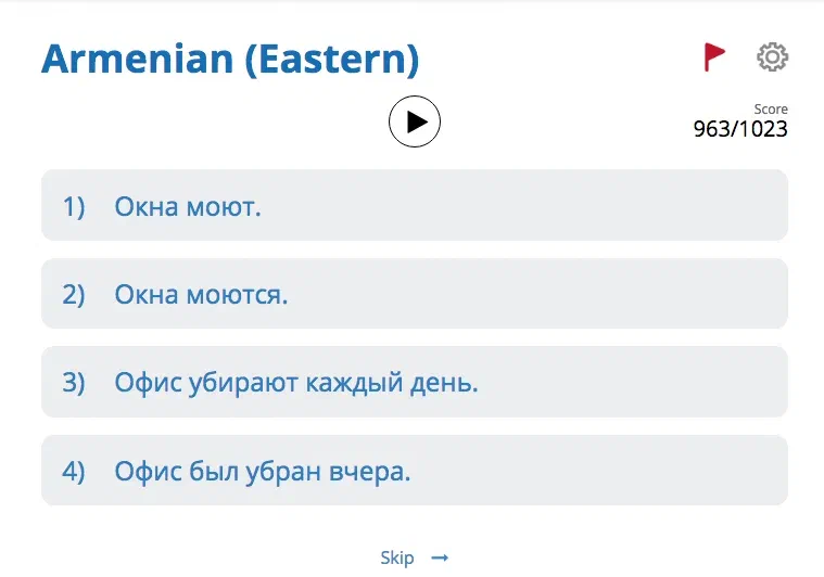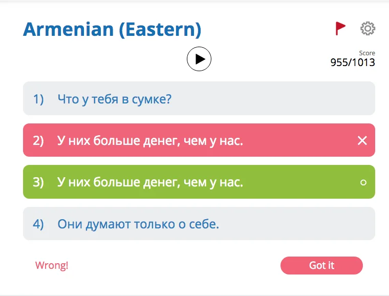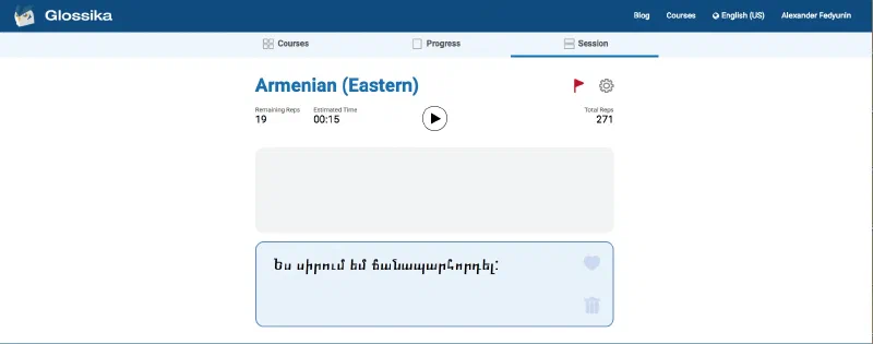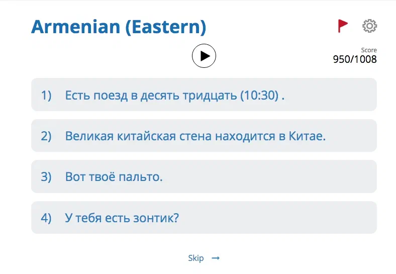 Интересный китайских проект по созданию аудио-уроков для изучения иностранных языков Glossika. Я на них наткнулся летом, тогда у них единственных были в наличии достаточно добротные файлы на армянском (а оказалось что даже внутри Армении найти хороший материал для аудирования - проблема). Так вот у них - было. Купил себе курс, там множество файлов звуковых, на каждый день занятий, да ещё и версии для первоначального прочтения, для повторения, для диктантов даже. Но подробнее сейчас нет смысла рассказывать - ребята изменили концепцию монетизации, потому сразу про новый уже сайт и процесс.