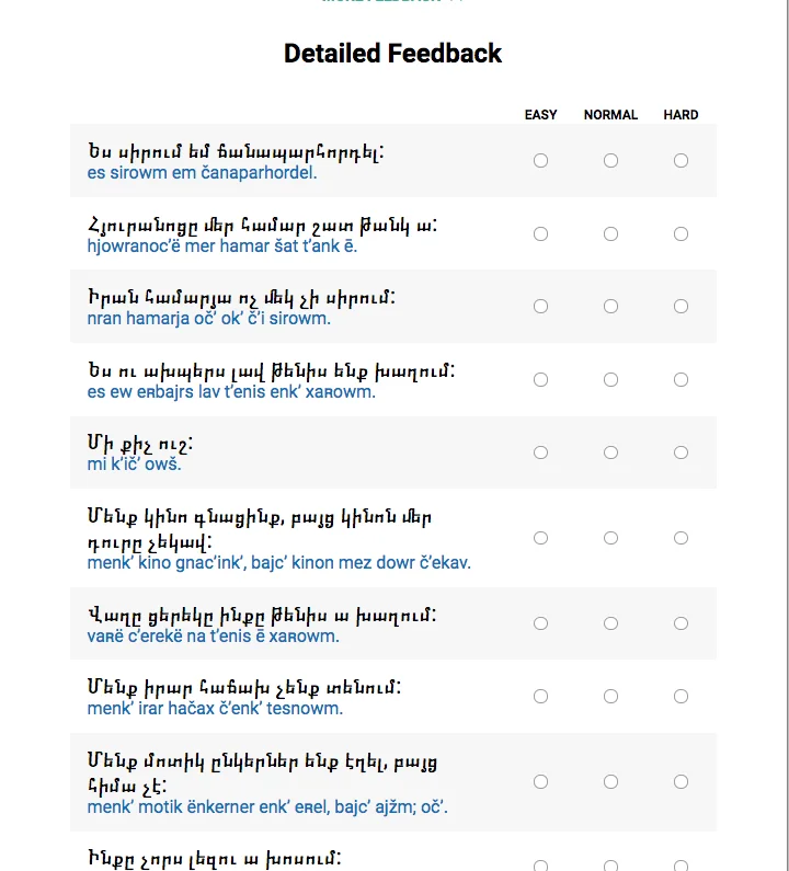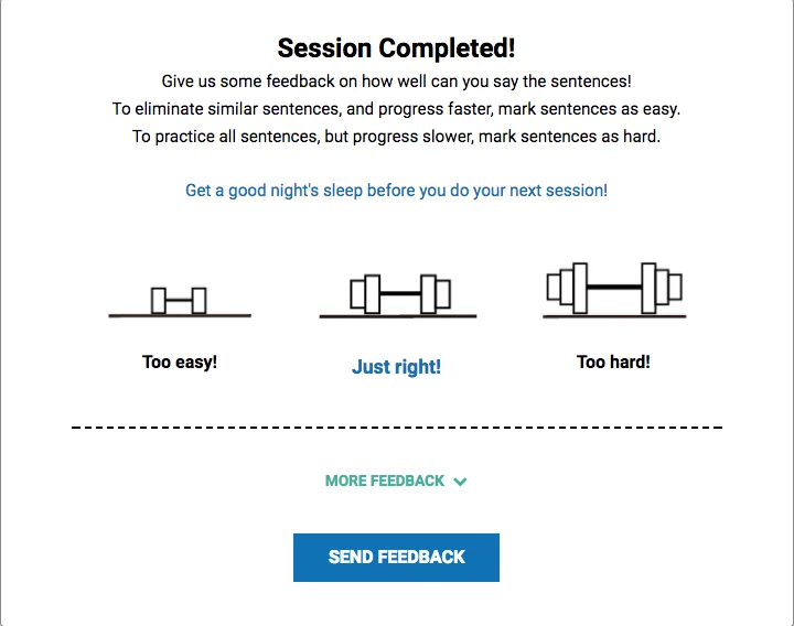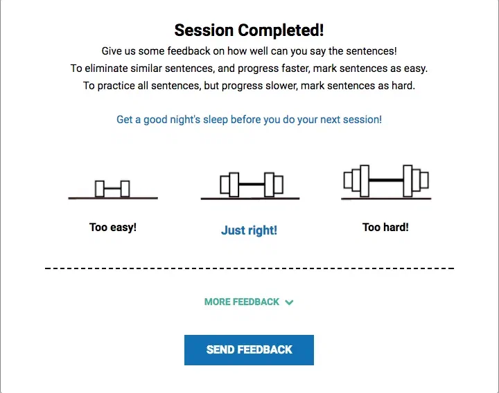 После прохождения заданий на день - обратная связь, для подстройки набора фраз на следующий день. Можно как просто оценить (легко, нормально, сложно) так и по каждой новой фразе которая была на уроке