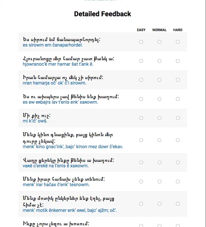 Идея в общем-то известная - только регулярное прослушивание и повторение за диктором позволяет освоить понимание на слух и говорение, проверено на себе - если я уже могу немного прочитать/написать на армянском, то устная речь у меня тормозит (в принципе я плохо слышу, а уж языки тем более). Потому и начал поиск ресурсов, чтобы каждый день можно было 20-30 минут повторять разные фразы.