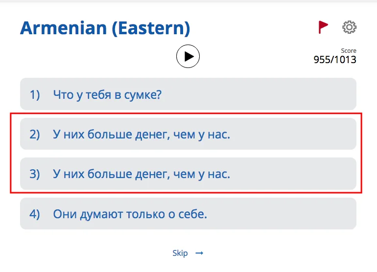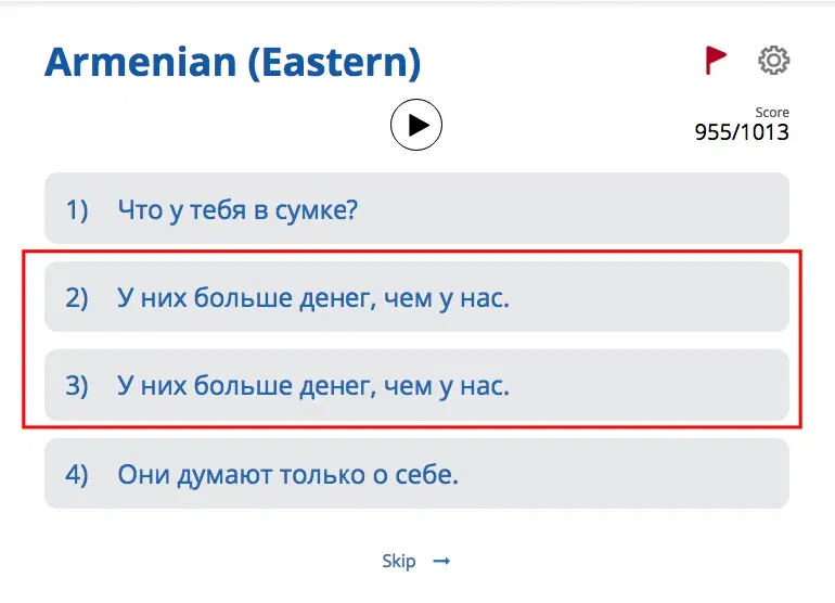 Не знаю как в английском, в курсе для армянского есть косяки - предлагают два варианта перевода полностью идентичных, нужно тупо угадать. Проблема в “сырости” курса, на армянском две разные фразы переводят одинаково, понять какой вариант правильный - невозможно. Надеюсь поправят. Регулярно пишу им в репорт о найденных ошибках.