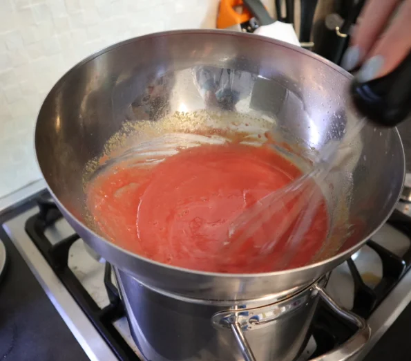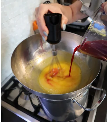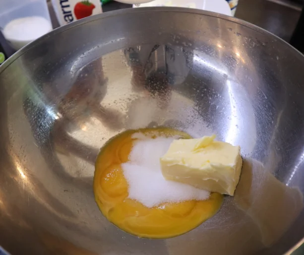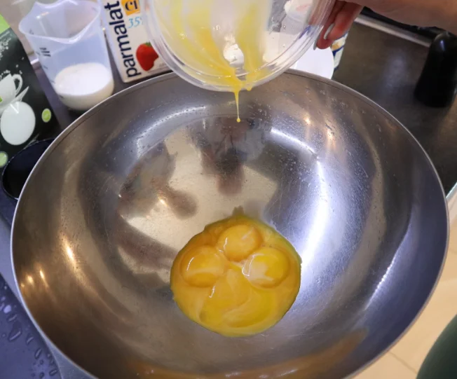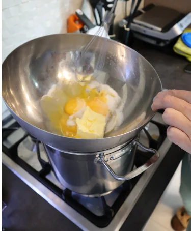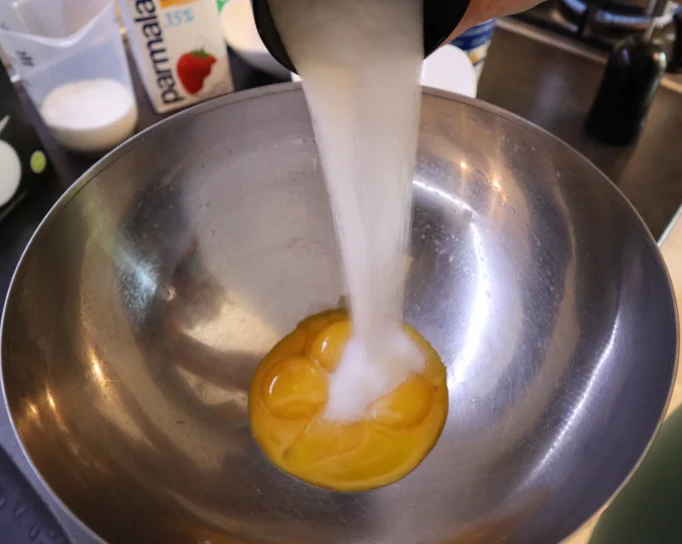 Берём все наши желтки и кидаем в чашку + весь эритрит + всё сливочное мало, достаём венчик и начинаем мешать по часовой стрелке, строго (это важно!) и помещаем чашку над кипящей водой.