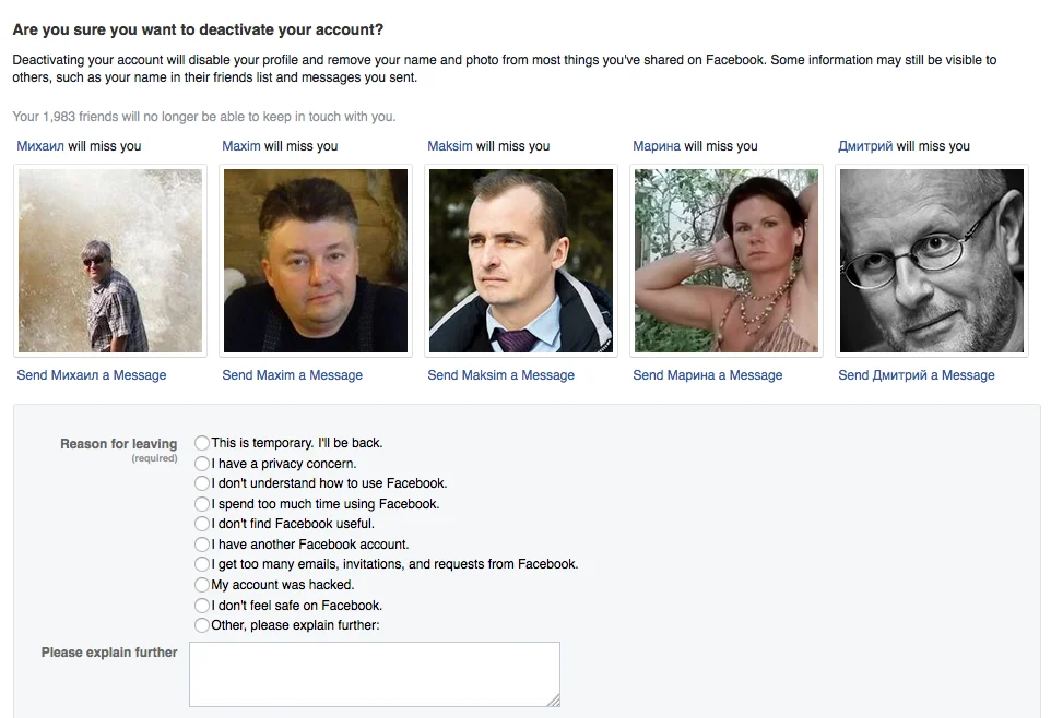 Если что - это вот тут описано (ссылка на запрещённый ресурс удалена) как сделать. Забавно картинки при выборе режима деактивации показывают они, что мол того, одумайся, друзья будут скучать :)