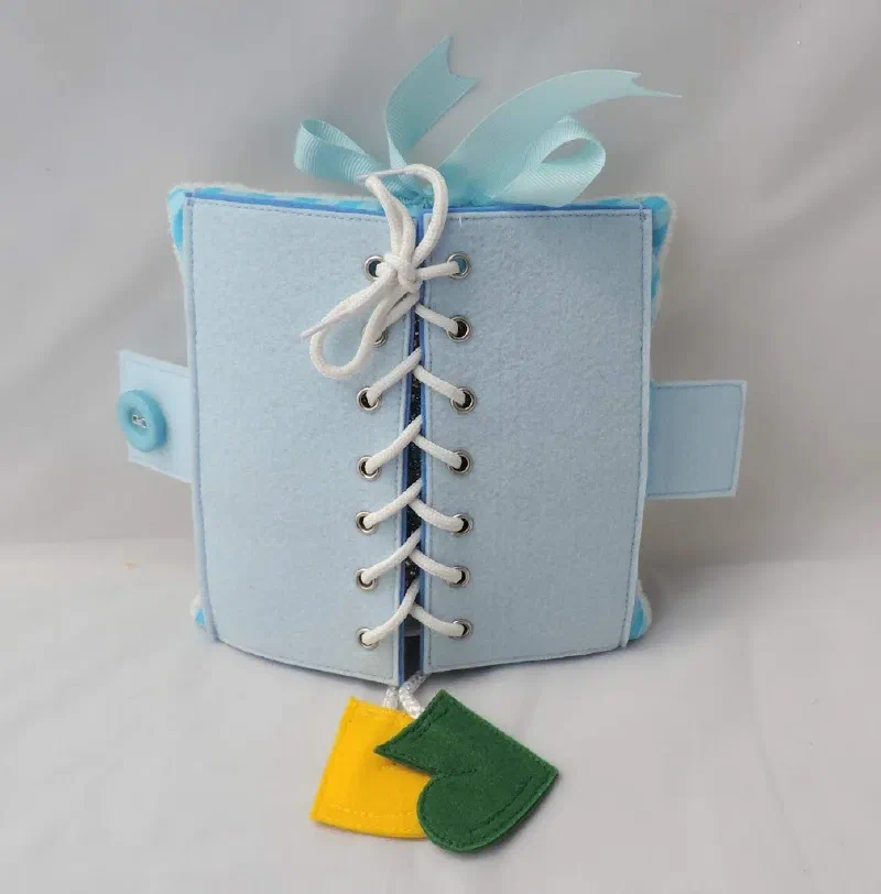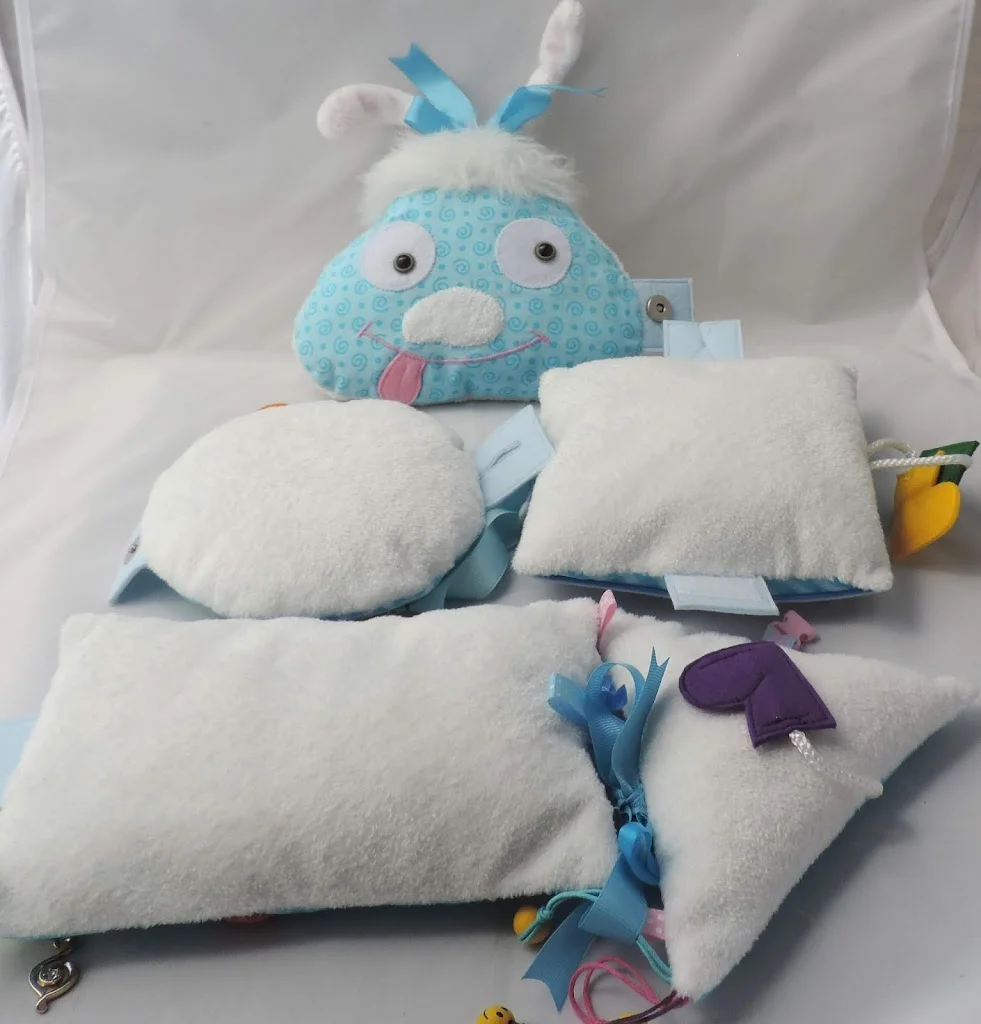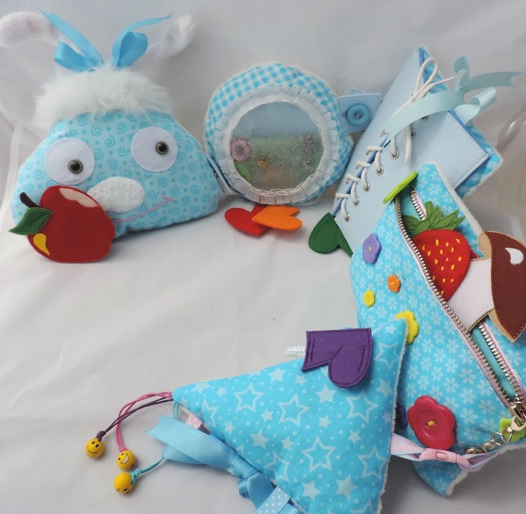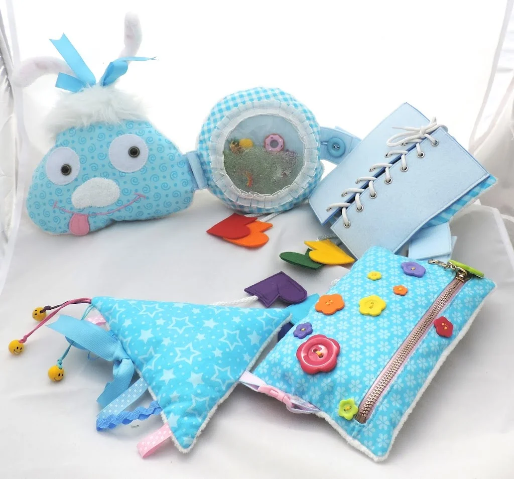 Здравствуйте!Предлагаю вам новую игрушку - тренажер застежек " Гусеничка". Гусеницу можно прикрепить к детской кровати ( голубые ленточки ) Каждый сегмент представляет отдельную игрушку.