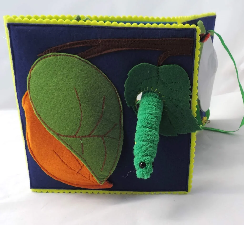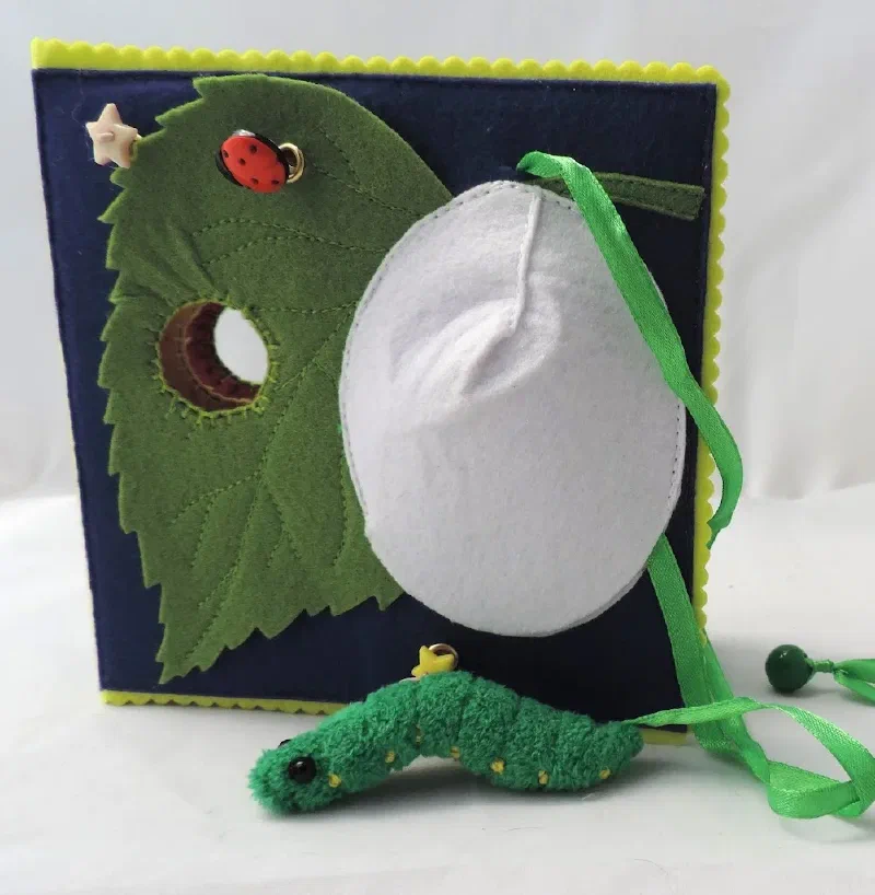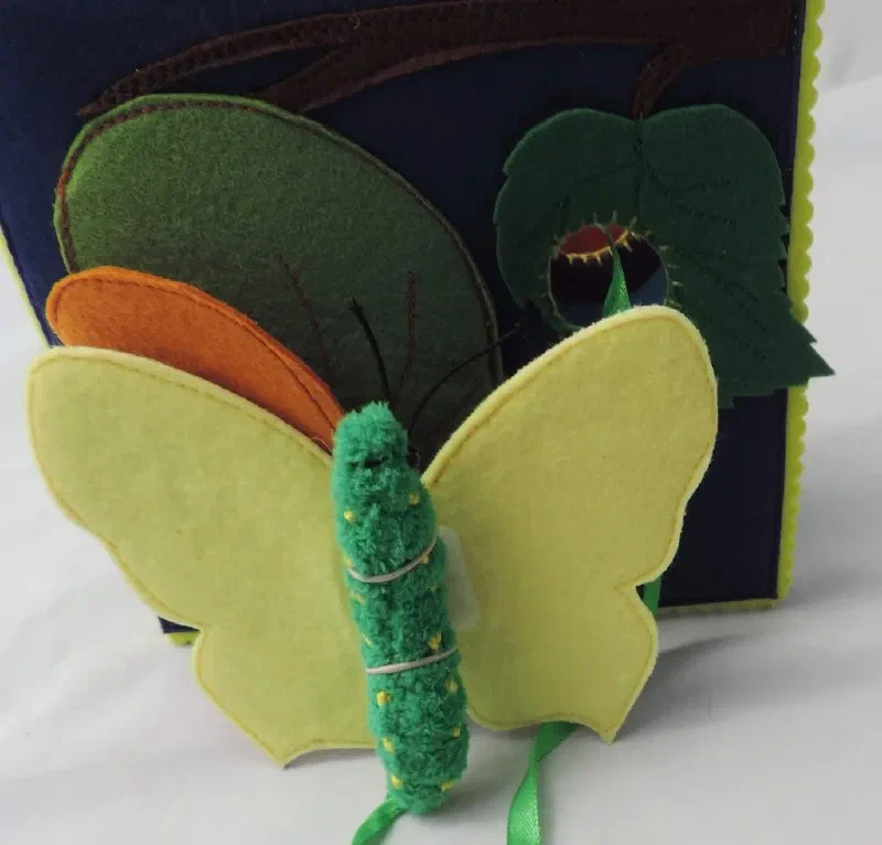 Внутри головы вшита погремушка, усики гнутся, в язычке магнит( для кормления ). Крепление магнитная кнопка. Бантик на голове позволяет крепить гусеницу к кроватке, а также тренировать пальчики завязывать бант , когда малыш подрастет.