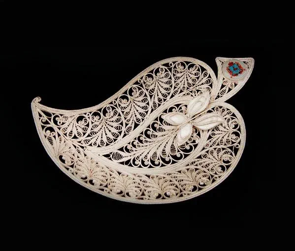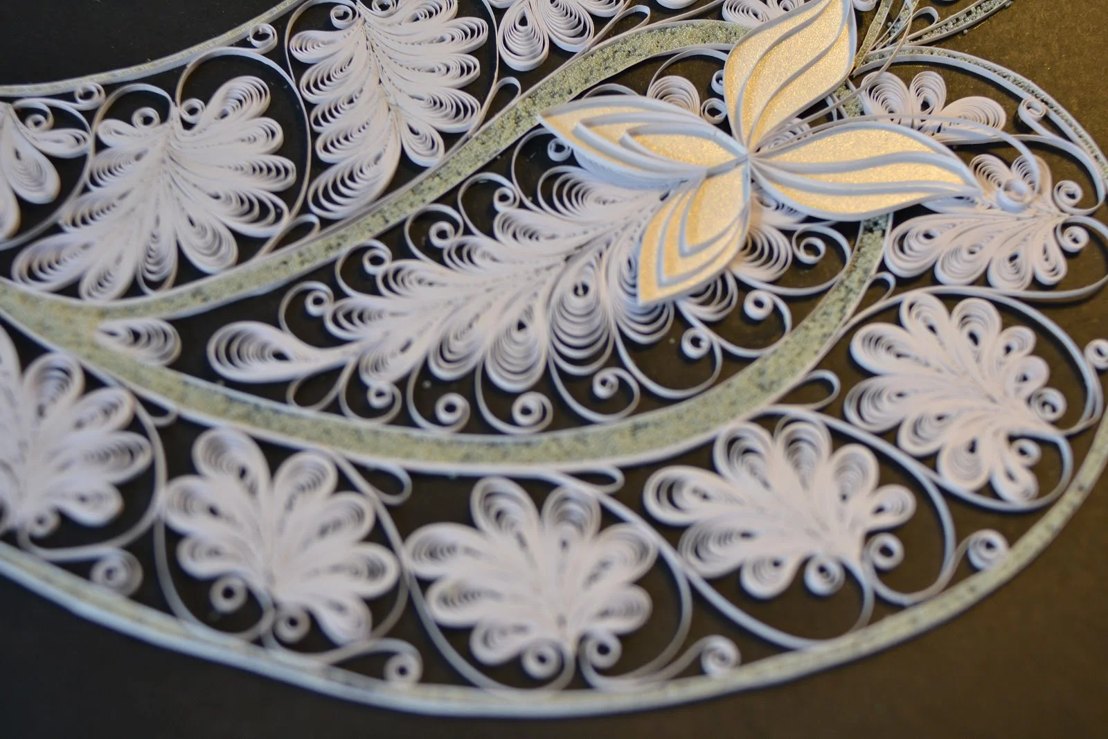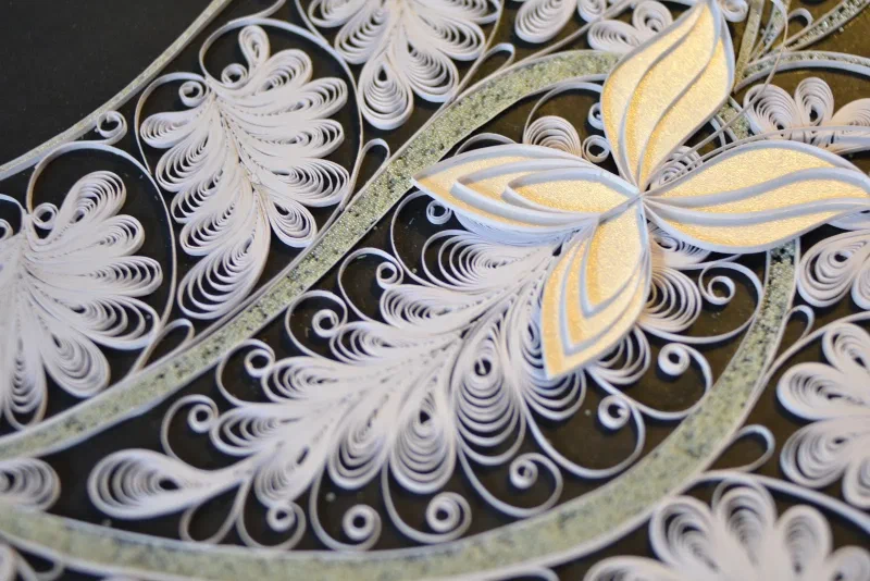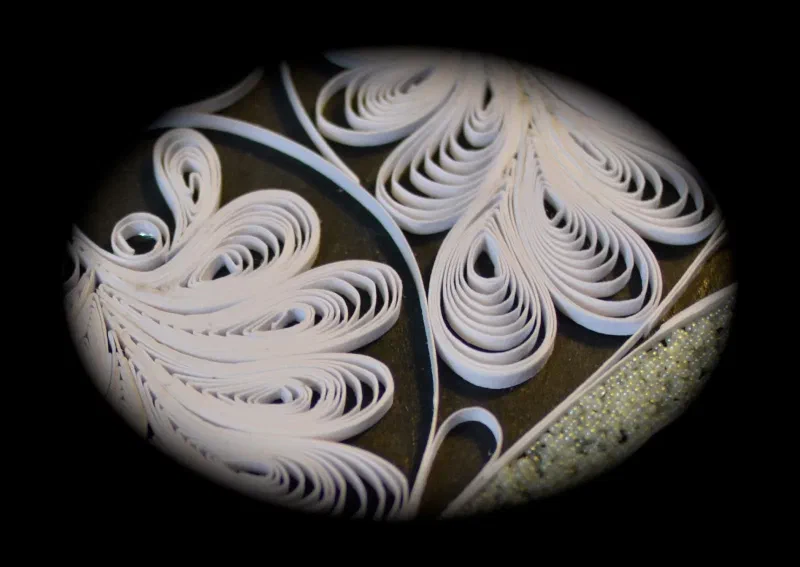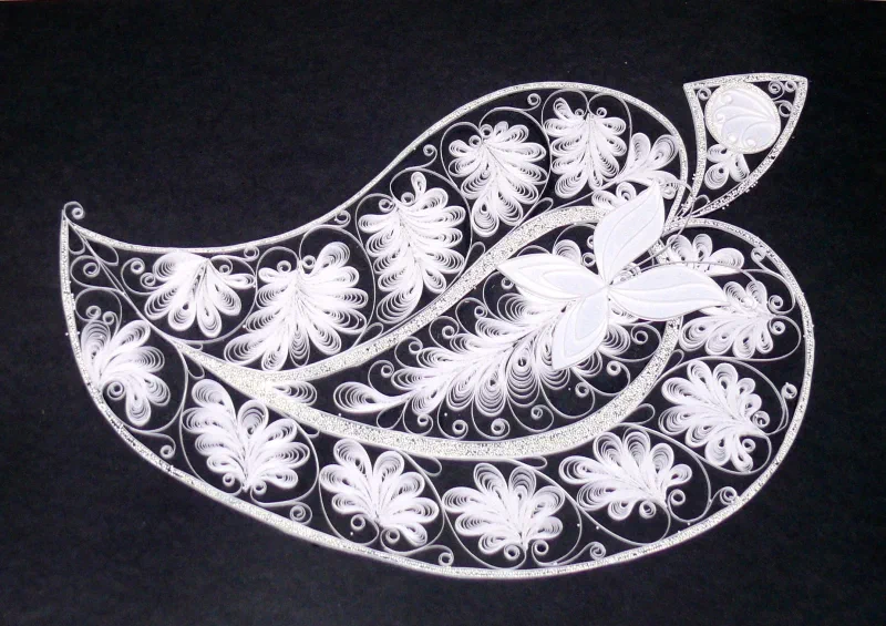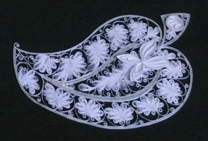“Филигрань или скань - один из древнейших видов художественной обработки металлов в России. Название филигрань происходит от латинских слов filum - нить и granum - зерно; скань - от древнеславянского - свить, скрутить. Названия указывают на особенность технологии - для изготовления филигранных изделий использовали скрученные проволочки и зернь, т.е. маленькие шарики. Техника филиграни состоит в следующем: узор из тонкой медной проволоки накладывают на бумагу, приклеивая по нарисованному контуру, посыпают серебряным припоем и затем элементы узора соединяют при помощи пайки. Объемные формы выполняют также, но бумагу с нарисованным узором наклеивают на железную заготовку. В гальваническом цехе изделия покрывают серебром. Производством изделий из филиграни в селе Казаково Вачского района Нижегородской области стали заниматься с конца 1930-х годов в артели Металлист.В настоящее время ювелирным искусством занимаются на Казаковском предприятии художественных металлоизделий. В середине 1950-х годов сложились характерные черты, свойственные лишь казаковской филиграни. Особенностью казаковских изделий является самостоятельное значение филиграни, она не применяется как часть украшения металлического предмета, как накладка на металл. Эти изделия целиком ажурные. По своему назначению работы казаковских мастеров - вещи бытовые. Это конфетницы, подстаканники, вазы, шкатулки. Для казаковских изделий характерен, в основном, белый цвет посеребренной медной проволоки. Словно инеем покрыты ажурные произведения народных мастеров, они завораживают серебристо-белым цветом русской зимы, придавая вещам звонкость заснеженных полей, торжественность и чистоту морозного леса…” Меня поразило сходство этих изделий с квиллингом, который еще называют- “Бумажная филигрань”. И я решила повторить казаковские узоры в квиллинге. Работа сделана из полос 1,5мм .