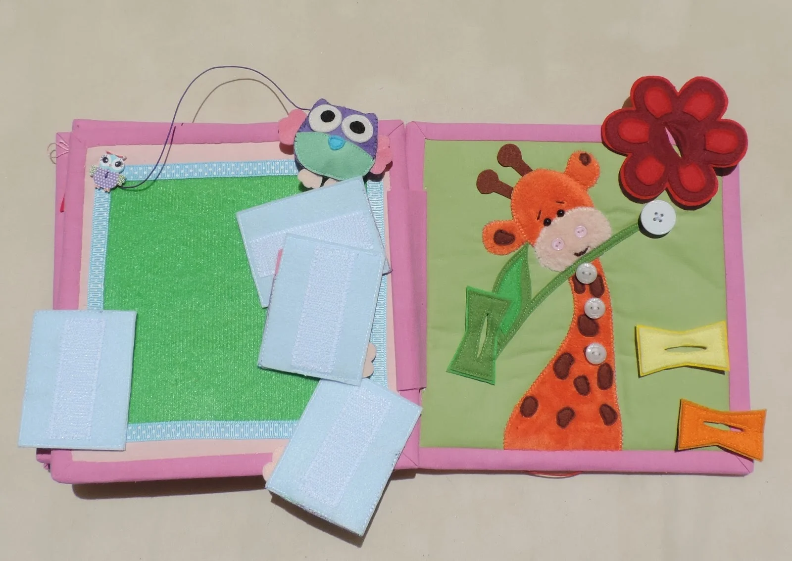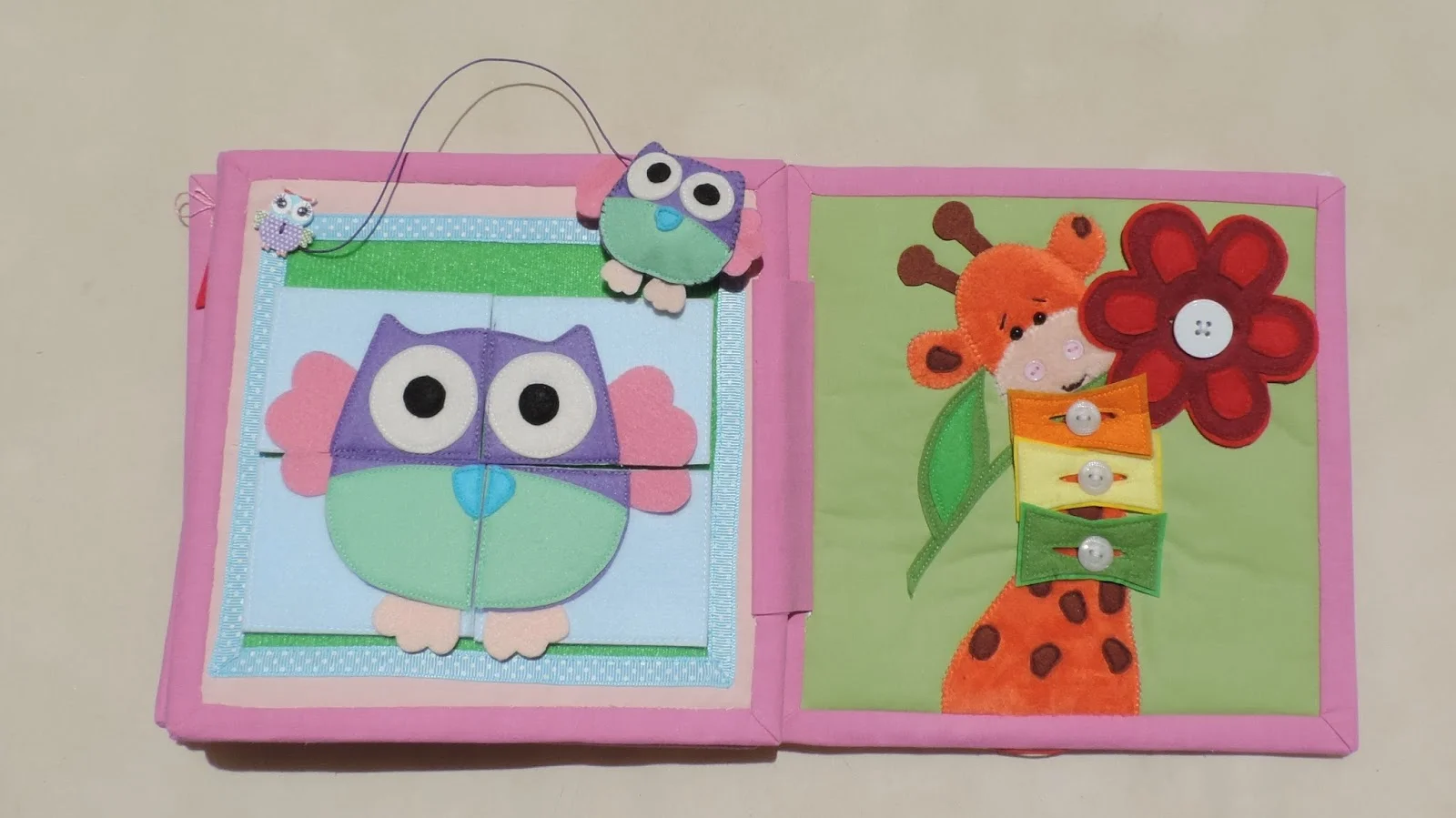 Собираем пазл Сова, пример - маленькая сова, внутри пищалка. Учимся застегивать пуговицы украшая жирафа бантами . Цветок так же на пуговице.