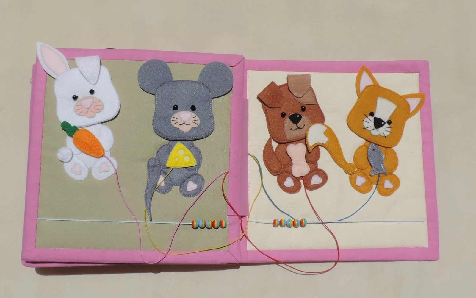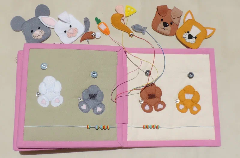 Учимся находить части животного, определяем кто что ест, кто какие издает звуки. Есть бусинки для тактильных ощущений и можно учить счет.