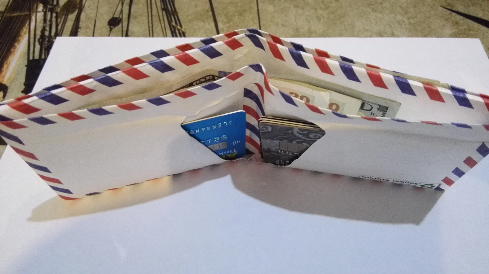 Отличная идея у ребят - из специального материала, который похож на бумагу, но при этом он не мокнет, не рвётся и не изнашивается. Tyvek от Dupont. При этом выглядит он реально как конверт, потому только любопытные продавцы таки осмеливаются что-то про него спросить, тогда можно провести трюк и попросить их порвать его. Смешно наблюдать за реакцией, они просто реально боятся порвать его вместе с деньгами, приходится деньги вынимать и просить таки разорвать :) Пока ни у кого не вышло, думаю что надо как-то в барах начать это монитезировать, типа спорить на коктейль с барменами.