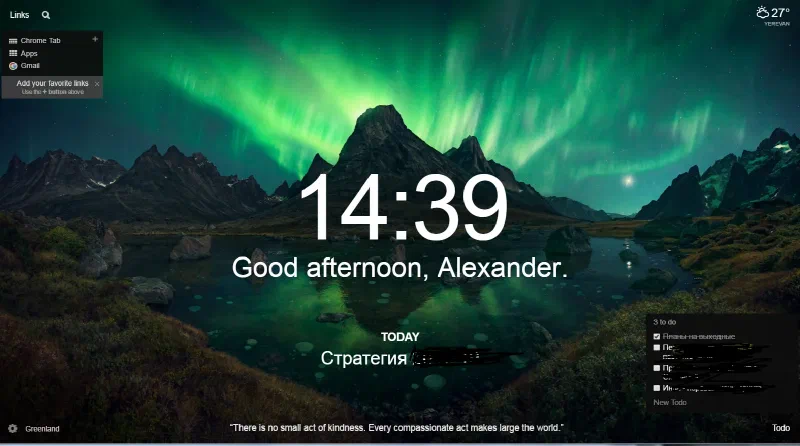 И там он просит внести основной фокус на сегодня, можно сделать список ToDo, настроить быстрые линки (соответственно это в центре, в правом нижнем или левом верхнем углу экрана). Вроде мелочь, а так нормально помогает - решил новости почитать, а оно тебе про главный фокус напомнило и кому ещё надо по мелочи написатьпозвонить.