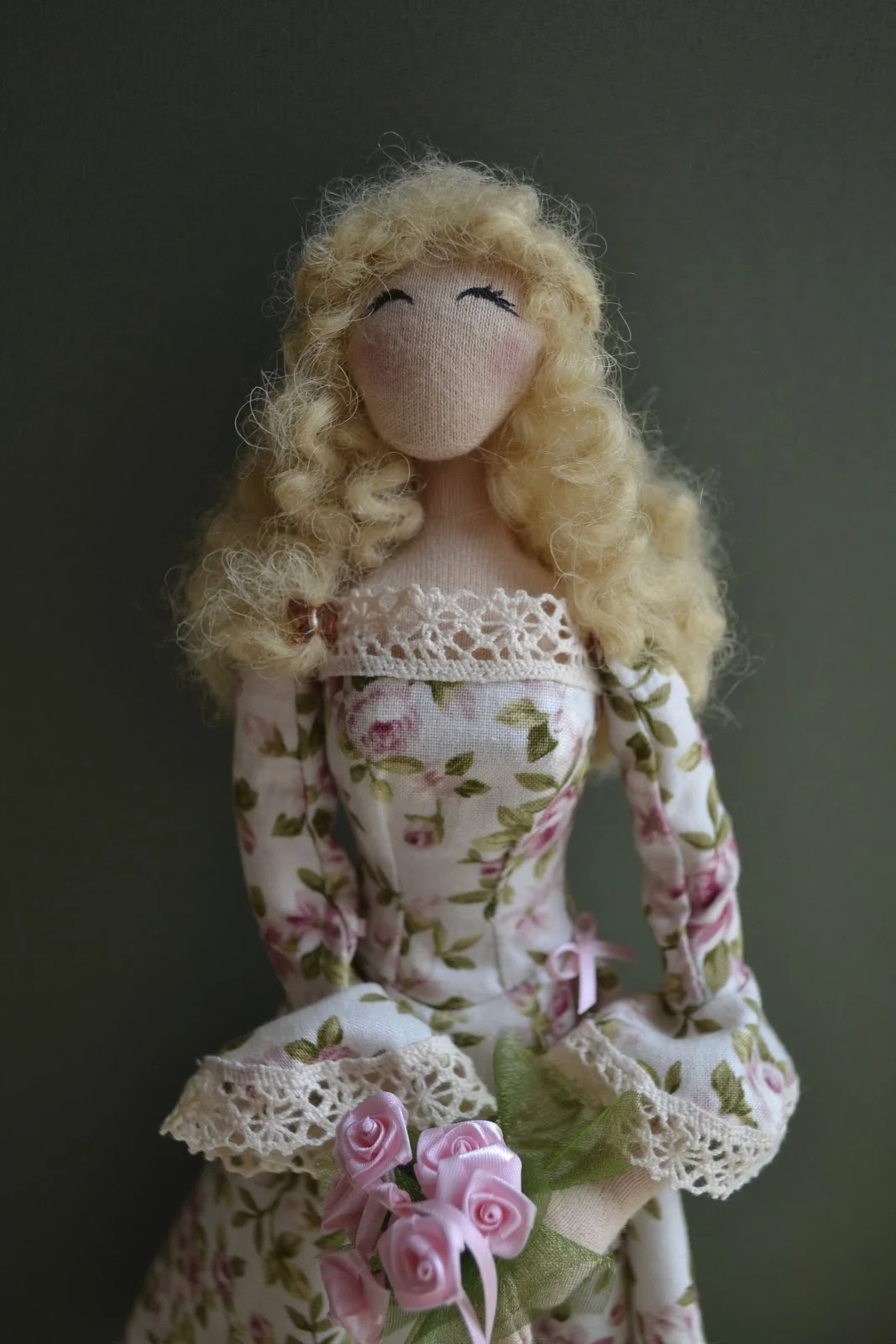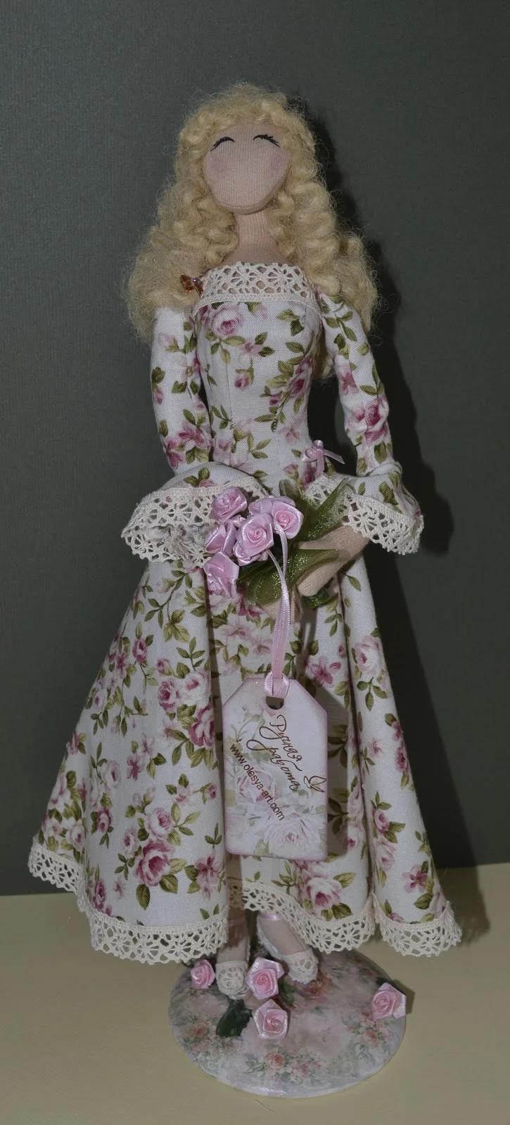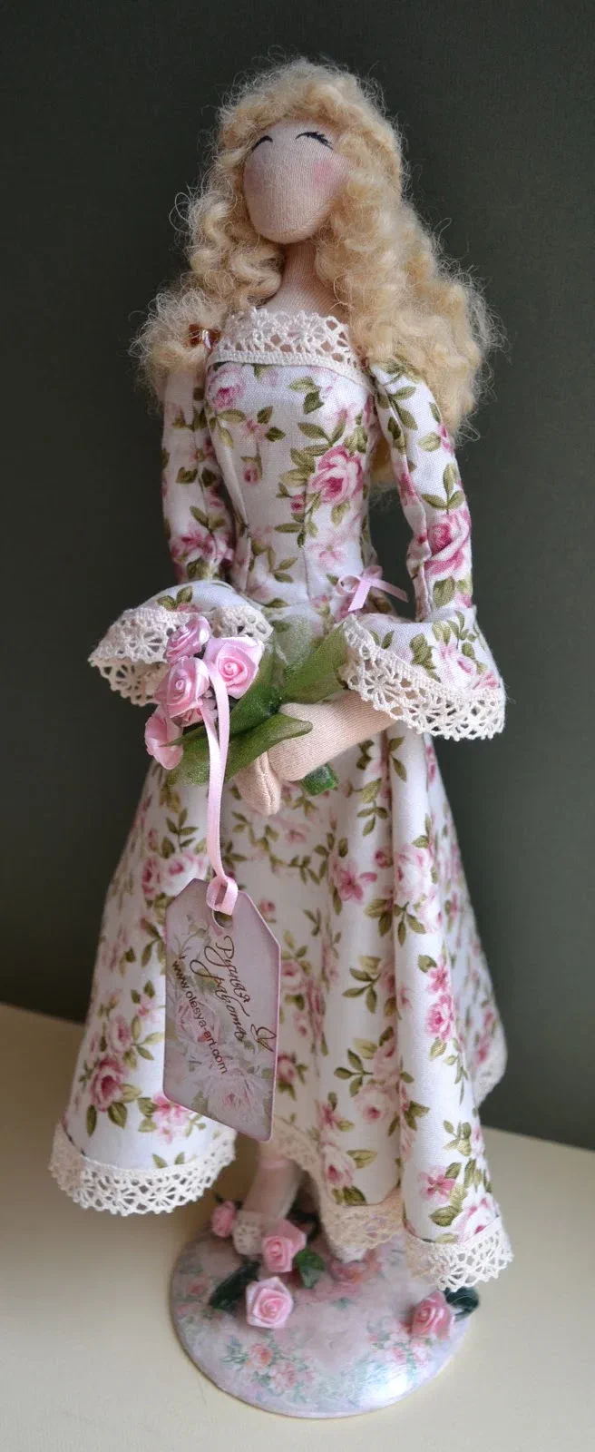Принцесса роз Тряпиенс 14 февраля 2013 Мой первый опыт освоения новой выкройки " фигуристой" девушки. Таких кукол называют ещё текстильными барби. Была сделана в подарок девушке коллекционирующей кукол.