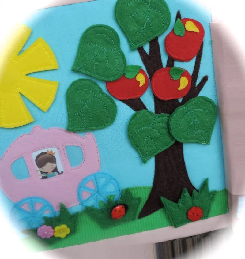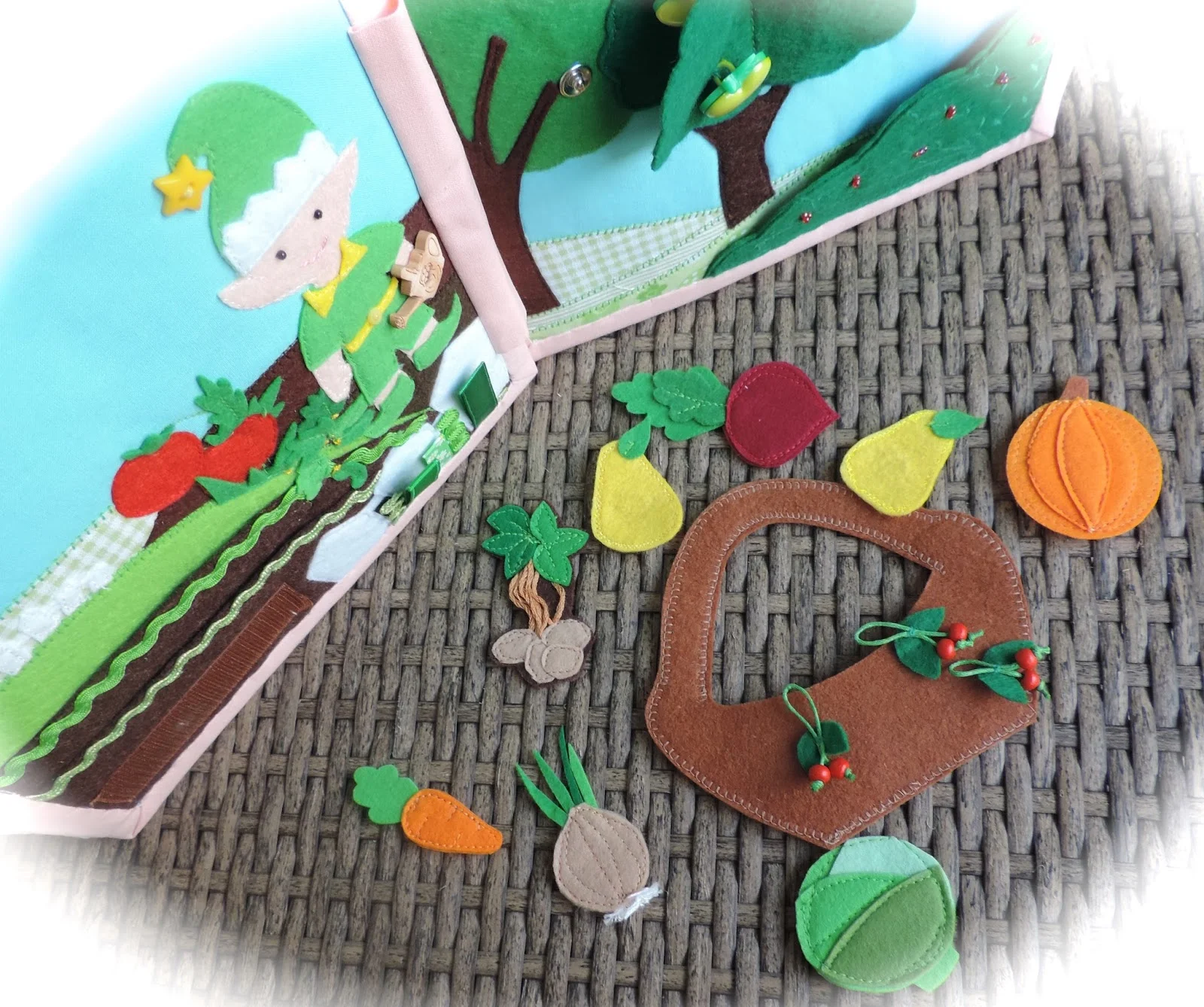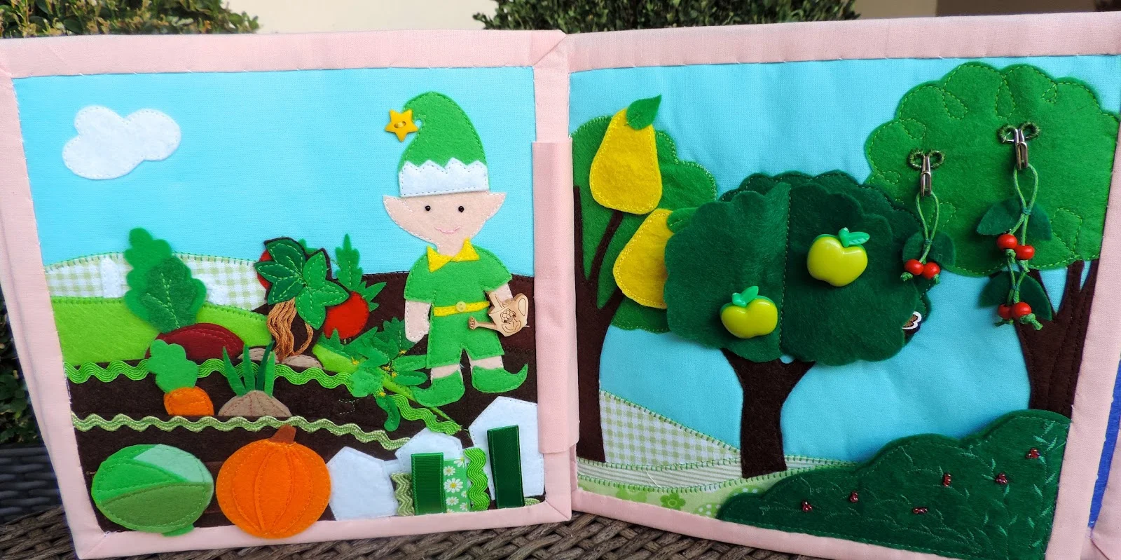 Второй разворот : Сад и огород . Хозяйничают в нем садовые эльфы. Можно им помочь собрать урожай. Понятия -фрукты, овощи . Учим пользоваться крючками , кнопками, велкро.