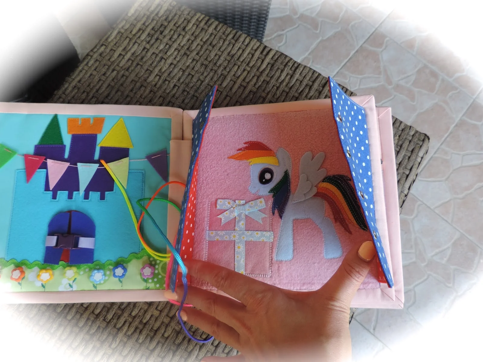 Все направлено на изучение цветов радуги ( замок, цветы) Можно пойти дальше в изучении цветов ( флажки) А также учимся открывать и закрывать ворота замка. Расшнуровав следующую страницу , узнаем кто живет в этом замке- Пони радуга. Так как задания очень сложные , то можно наградить ребенка , спрятав сюрприз ( например печенье)