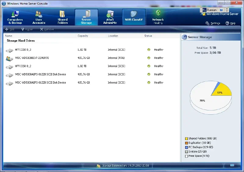 Чуть не забыл похвастаться - коллеги тут меня порадовали, подарили мне HDD на 2 Tб (точной такой же WD, который я в июне купил и долго не мог запустить). И теперь у меня суммарная ёмкость хранилища - пять террбайт, ага. Дома, этакий небольшой домашний сервер. И даже не верится, что когда-то совсем недавно фраза “пять террабайт” не имела вообще физического смысла, ибо Win NT в теории поддерживала емкости до террабайта, это казалось много и типа было круто что такая возможность есть в системе, ага.