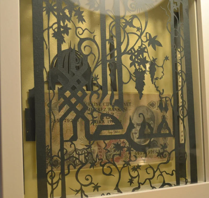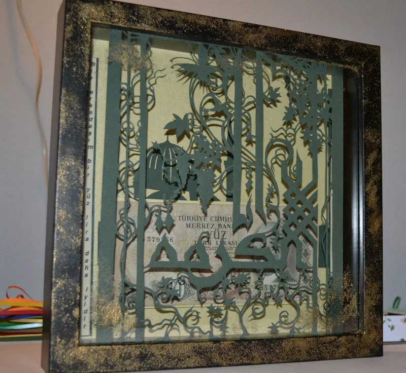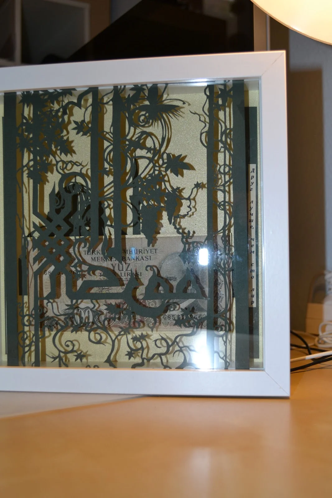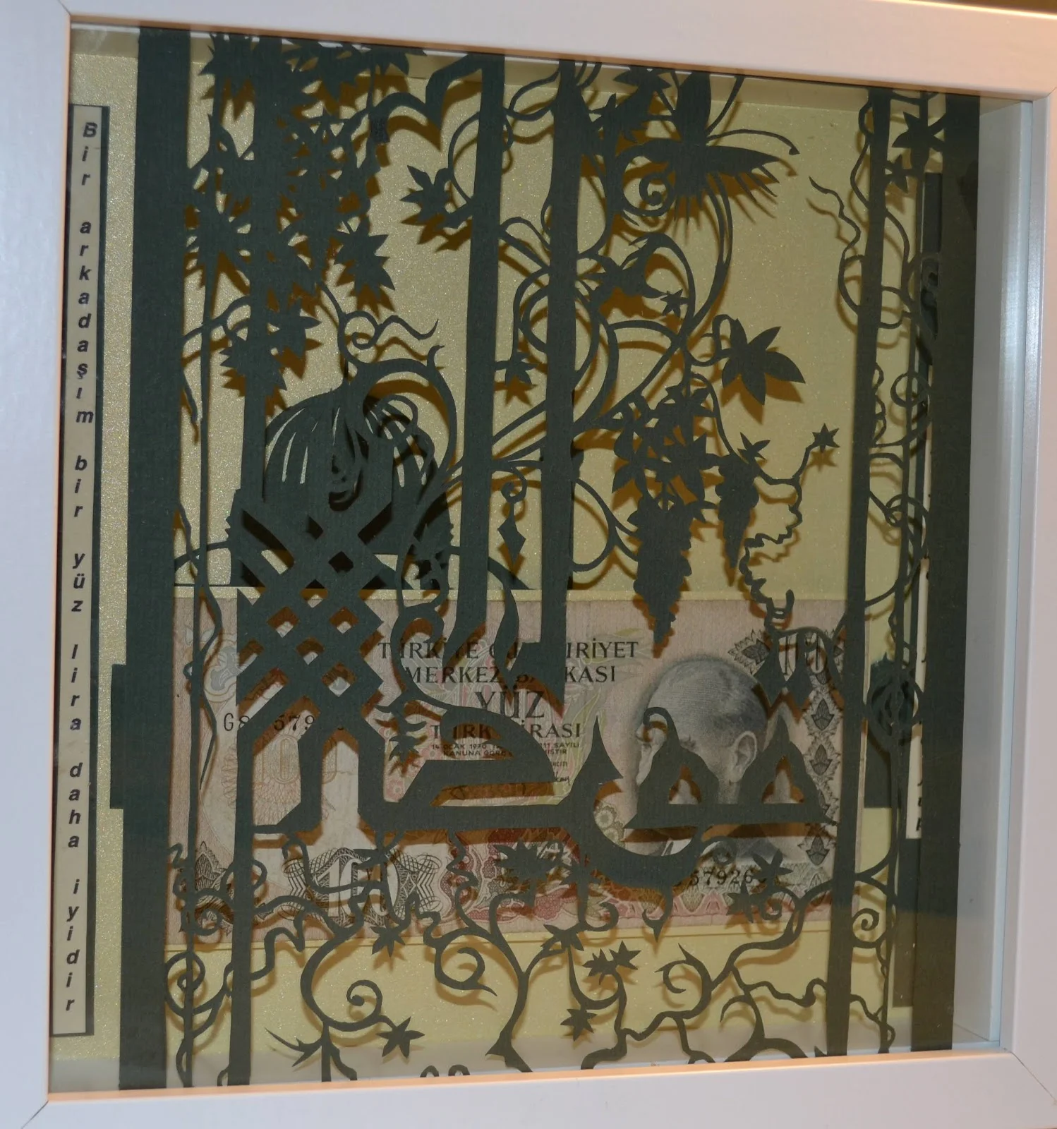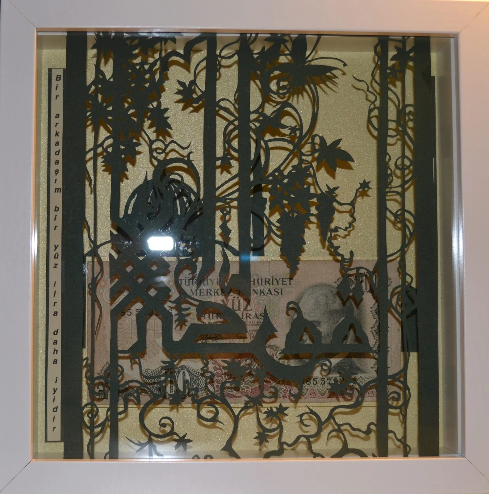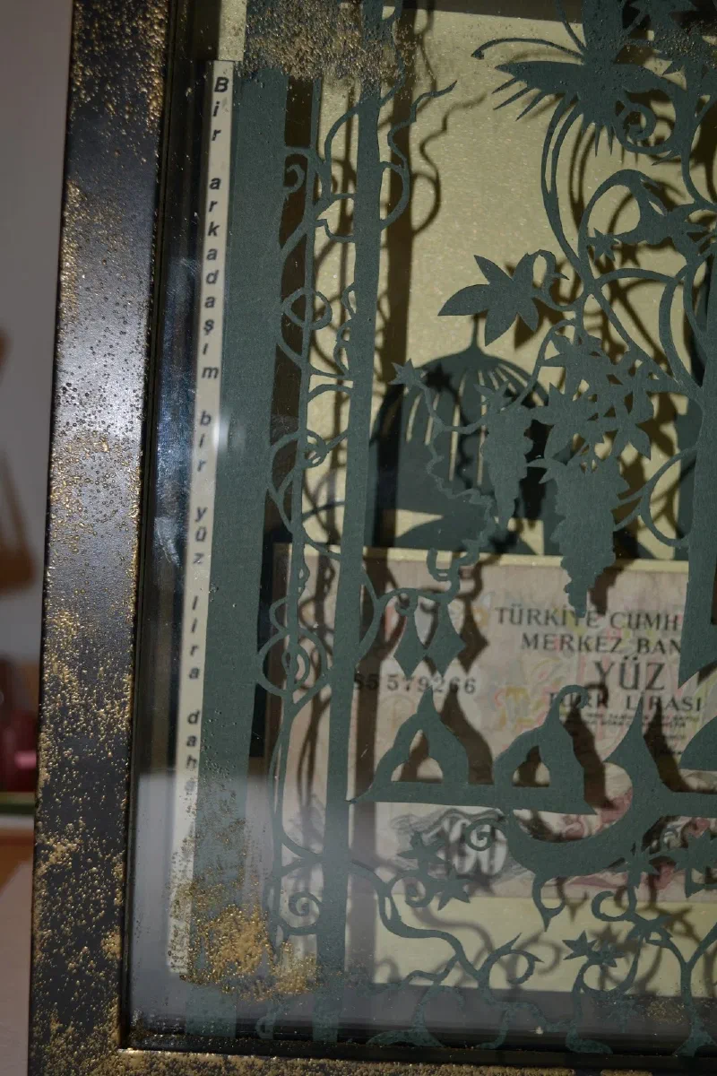 Подарочная картина - купюра в сто старых турецких лир, в рамке из арабской вязи. По бокам на турецком и русском языках написана пословица “Друг лучше чем сто лир”.