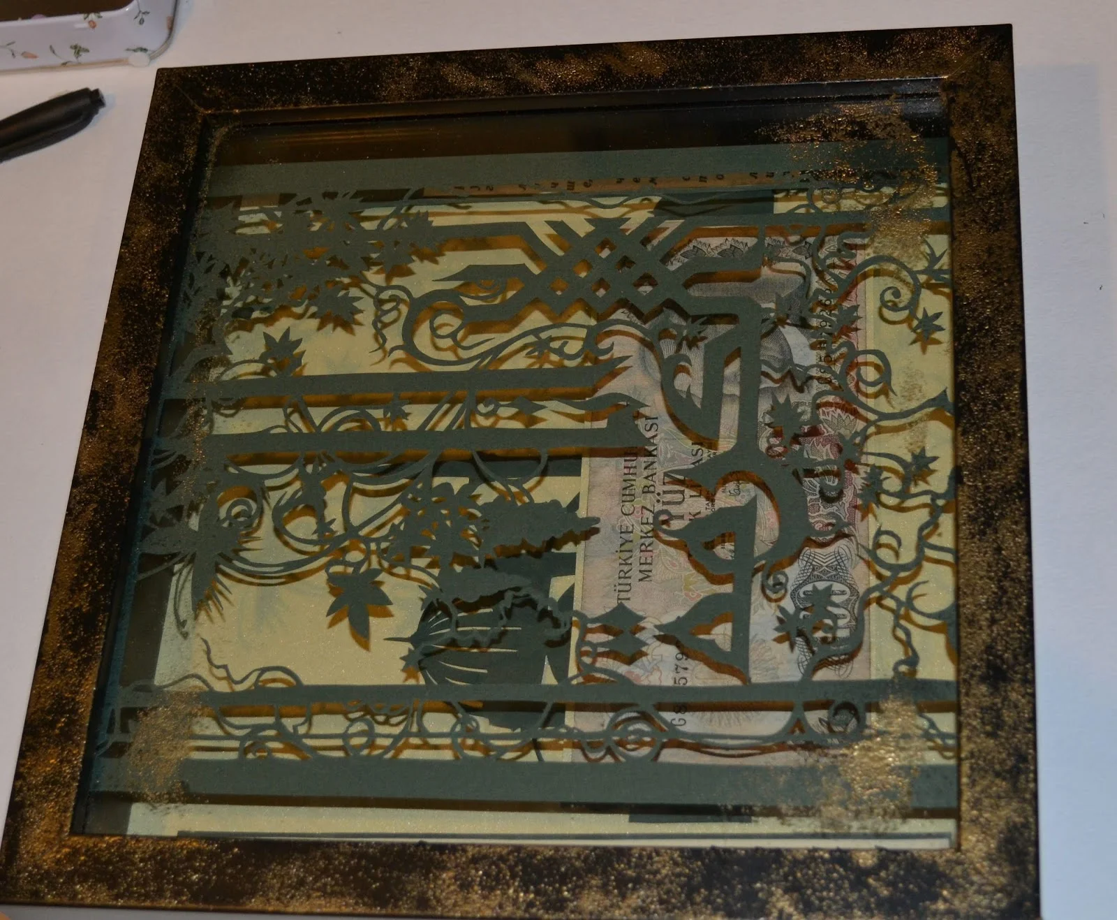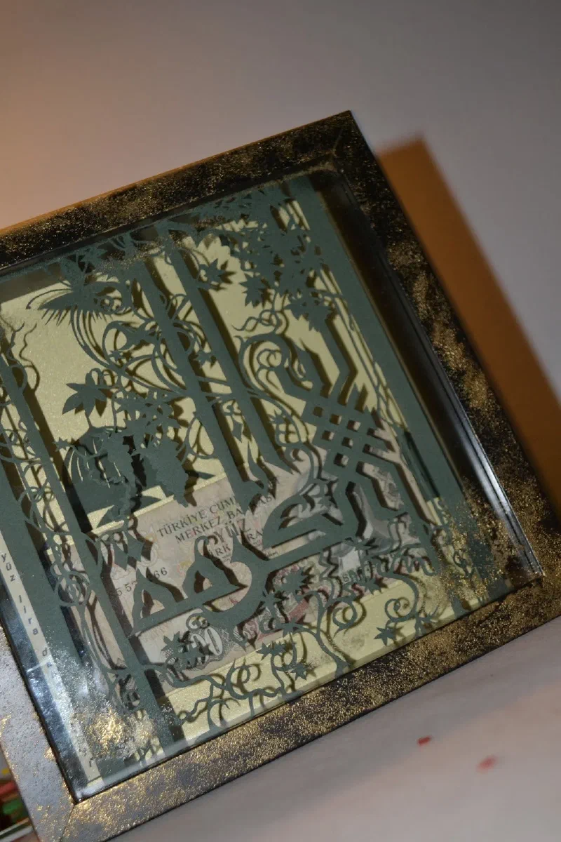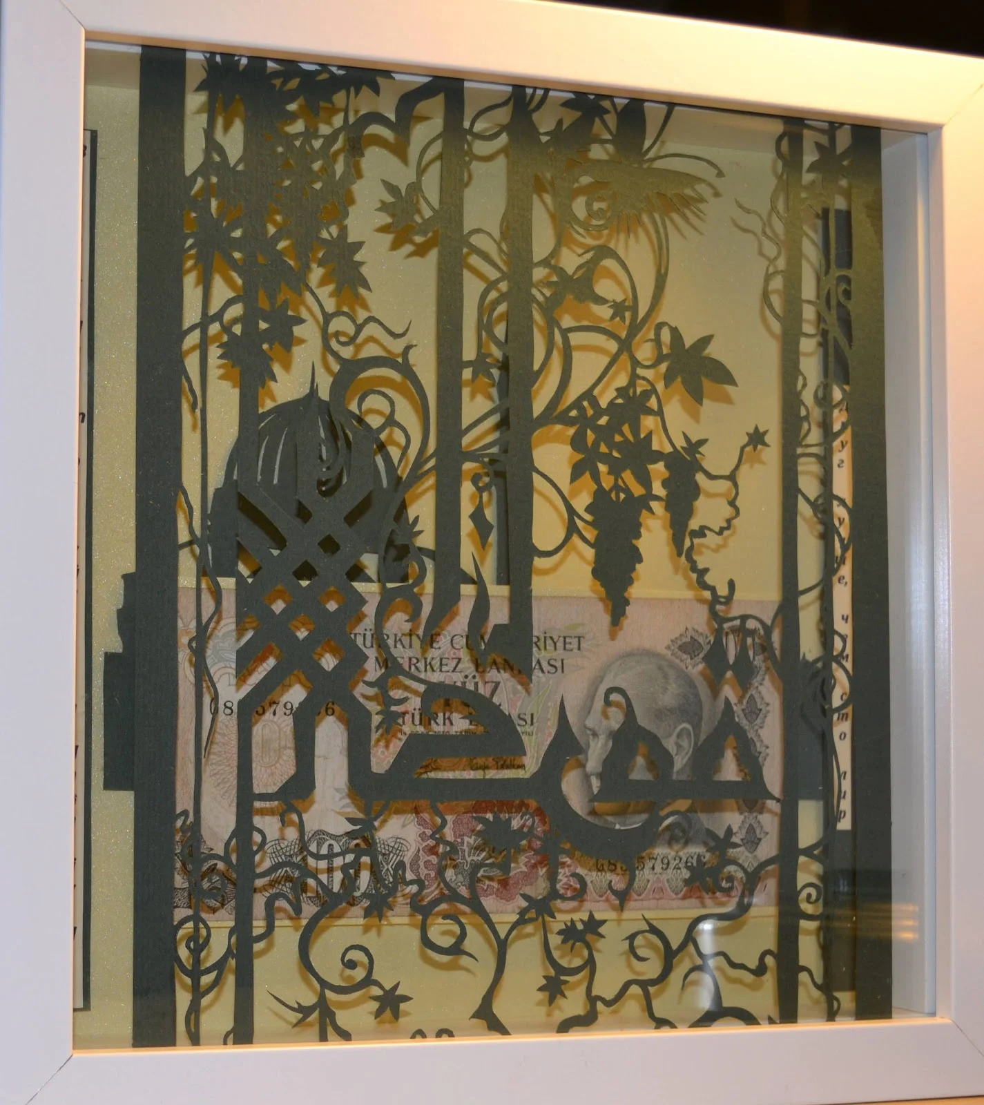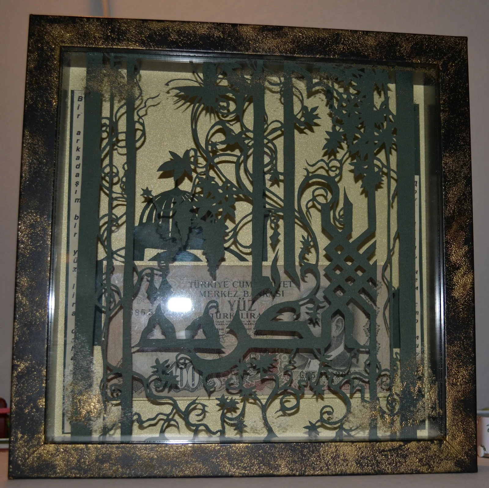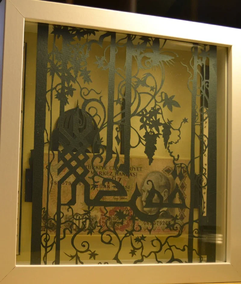 Подарочная картина - купюра в сто старых турецких лир, в рамке из арабской вязи. По бокам на турецком и русском языках написана пословица “Друг лучше чем сто лир”.