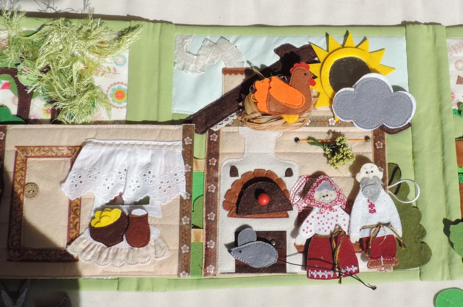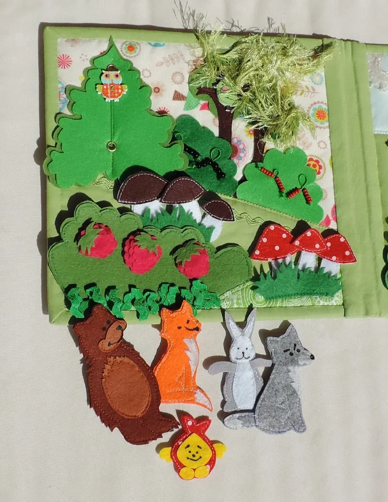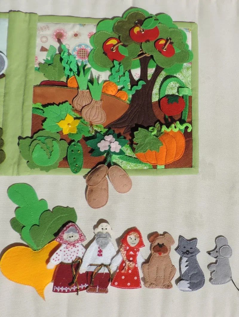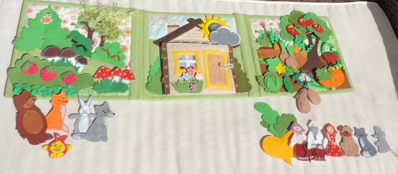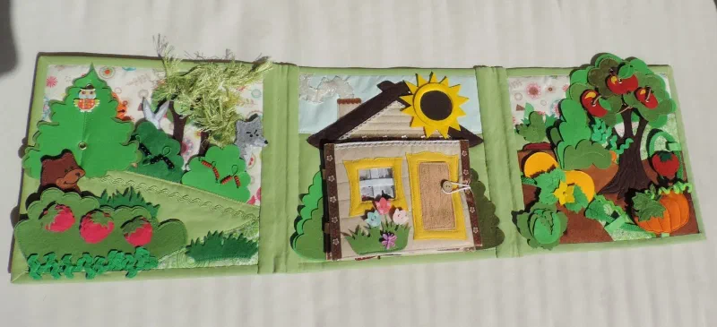 Развивайка " Первые сказки" 22 июля 2017 Новая развивающая книжечка " Первые сказки" Пуговички на резинках и кнопках. Кармашек для деталей Страничка огород и поле для сказки “Репка” Страничка лес и поле для сказки " Колобок" Страничка дом и поле для сказки " Курочка Ряба" Книга сшита по выкройкам Екатерины Мосейчук.