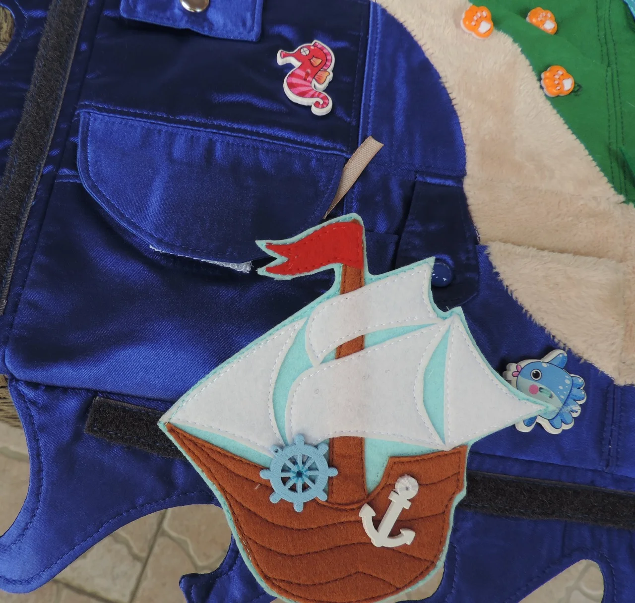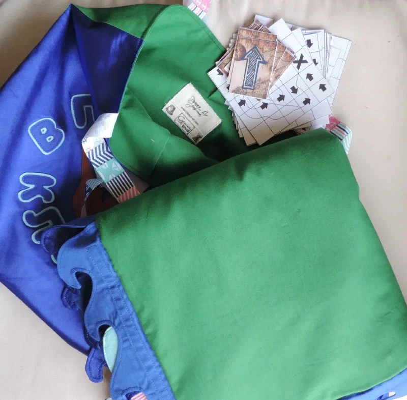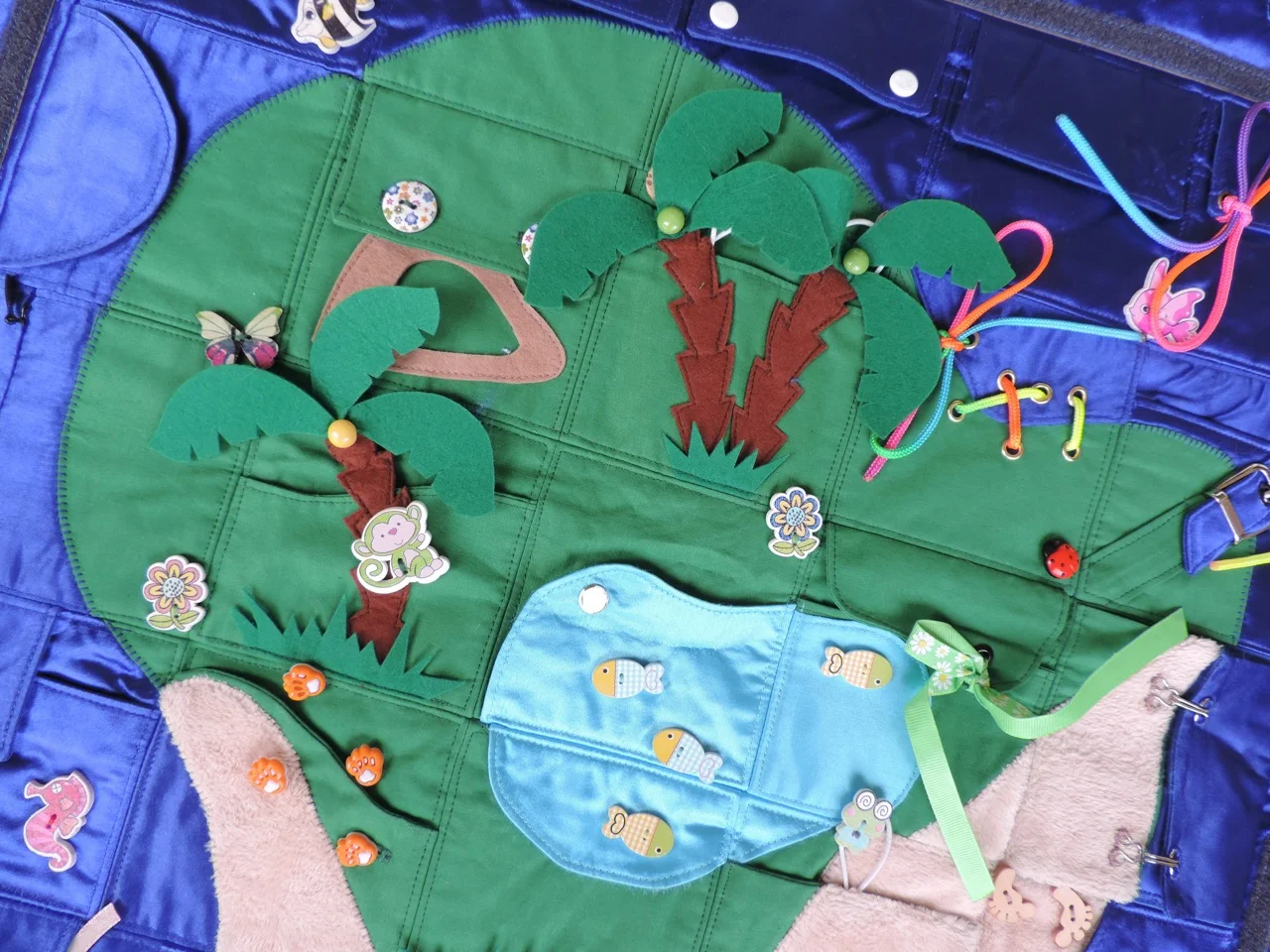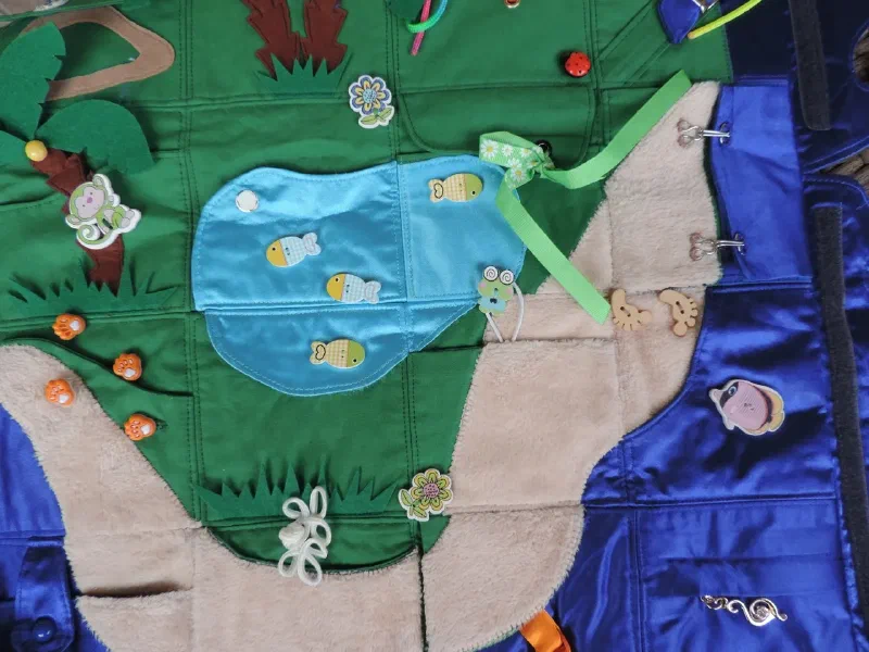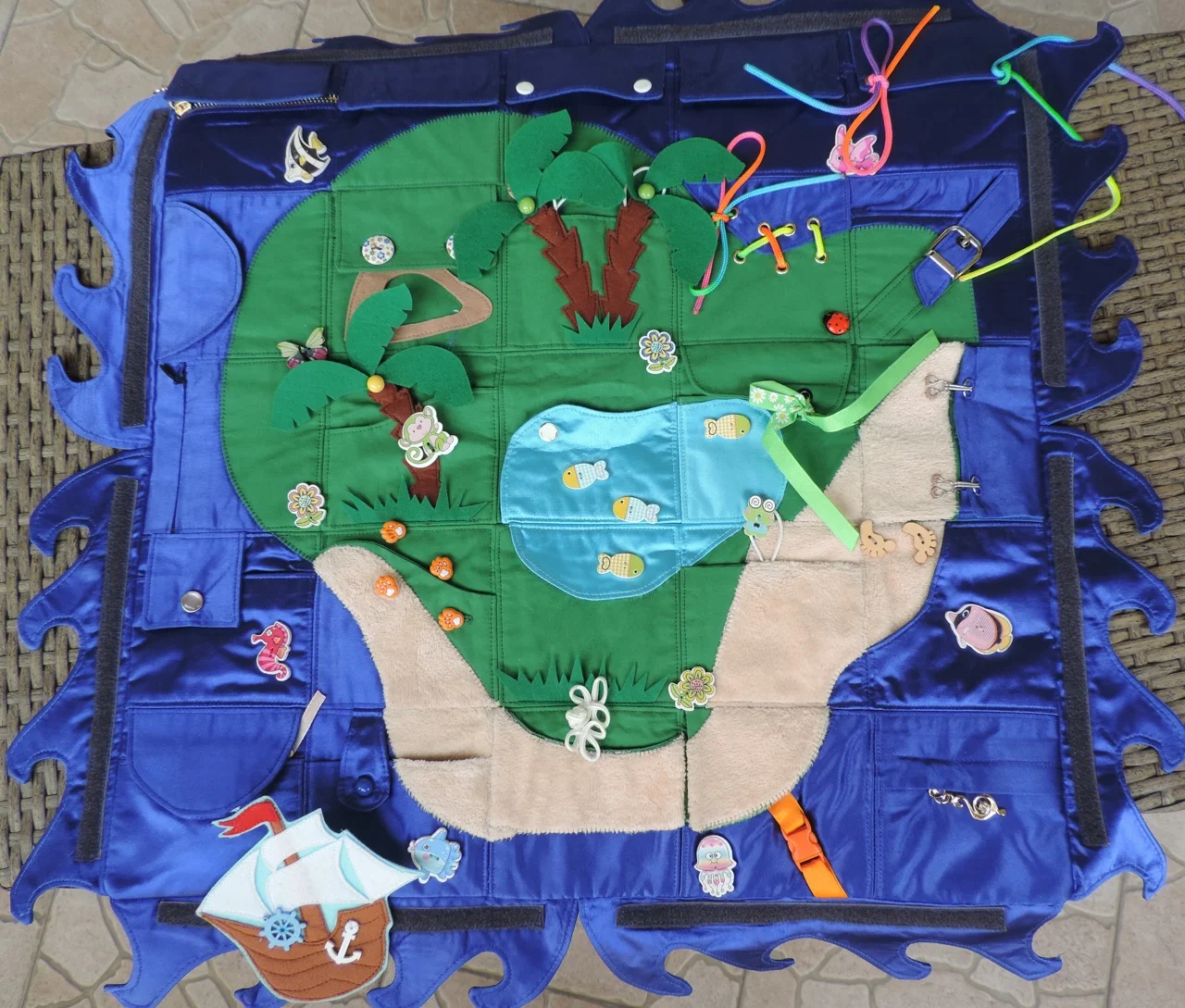 Всем доброго дня! Предлагаю вам новую " развивайку". Коврик 50/50 см с карманами. Можно искать сокровища и учиться работать с различными застежками ( пуговицы, молнии, кнопки, крючки, велкро)Коврик можно повесить на стену( есть крепления), а можно положить на пол (2 слоя синтепона). Коврик яркий , с большим количеством интересных деталей для увлекательной игры. Есть удобная сумочка для хранения.
