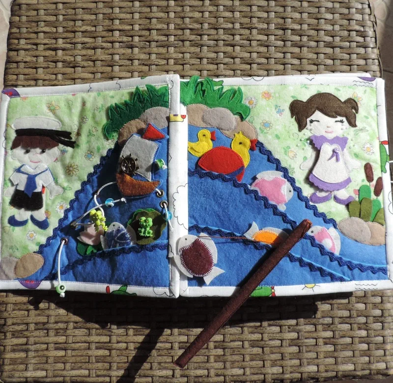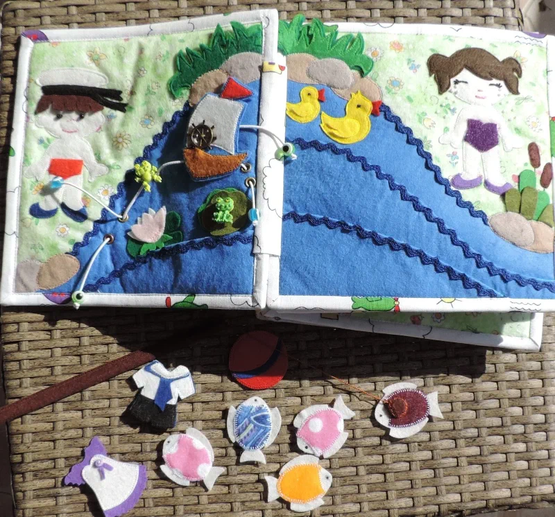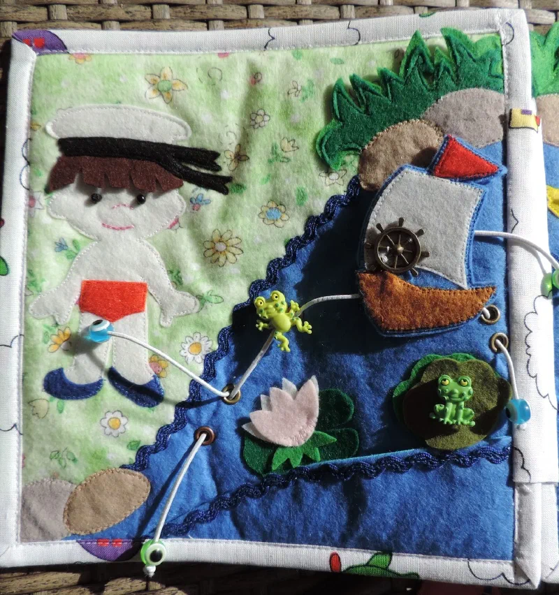 Одежда на липучке, кораблик и лягушка движутся. В рыбках и мяче магниты. Можно ловить рыбу и вытаскивать мяч удочкой. Слезы-бусинки, тактильные ощущения.