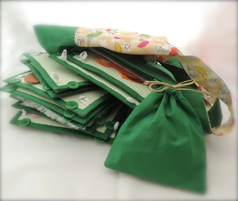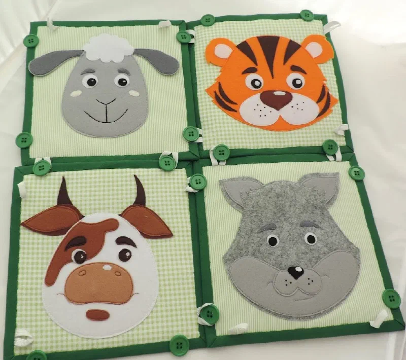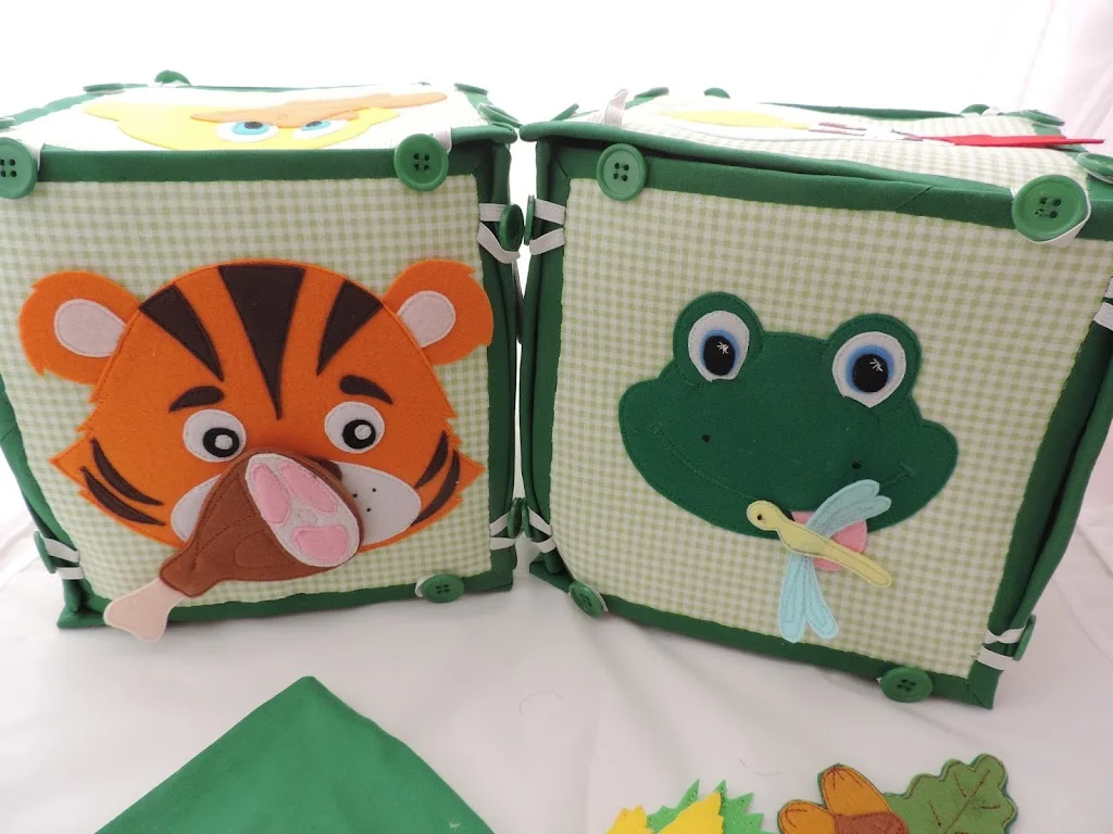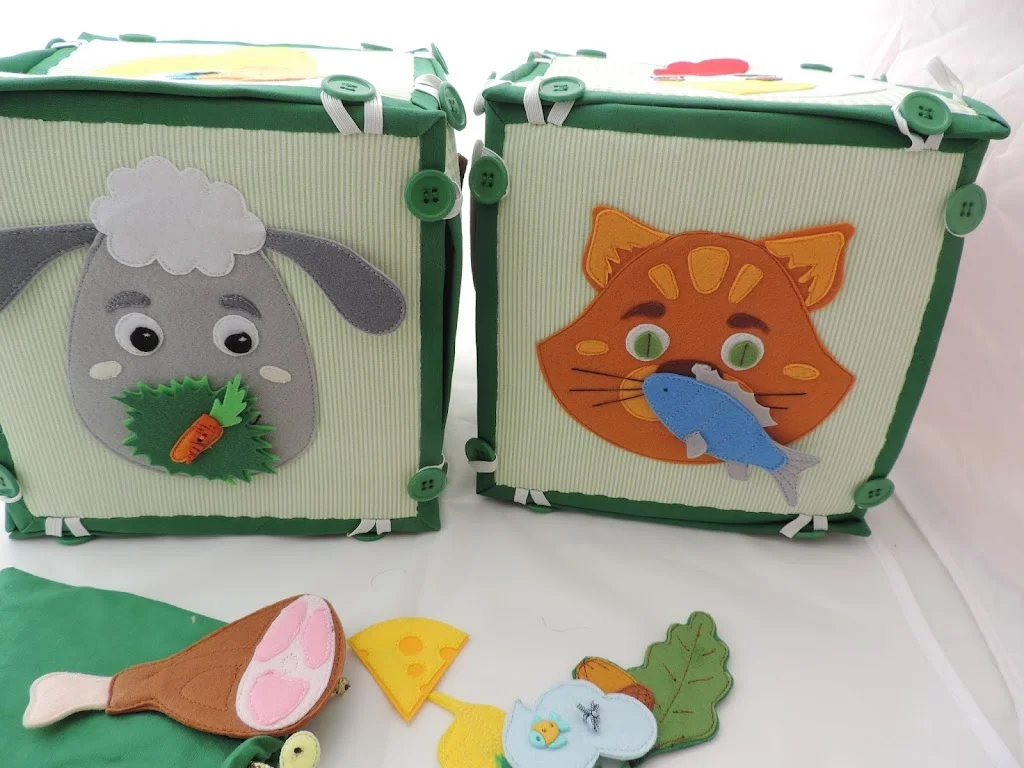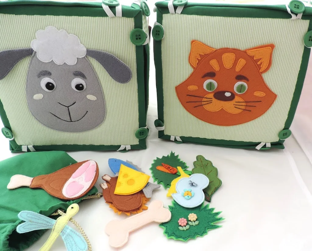 В специальном мешочке , есть еда. Можно покормить животных. Еда крепится на магнитах. Магниты вшиты в мордочки и еду.