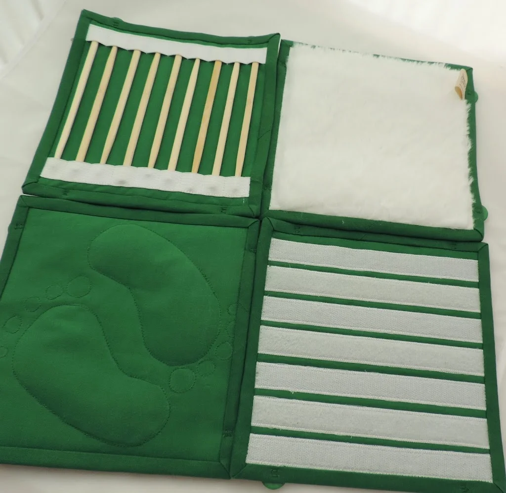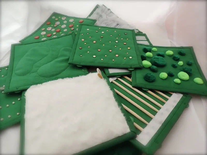 С другой стороны это массажный коврик. Для тактильных ощущений, можно трогать руками, а можно выложить дорожку и пройти по ней.